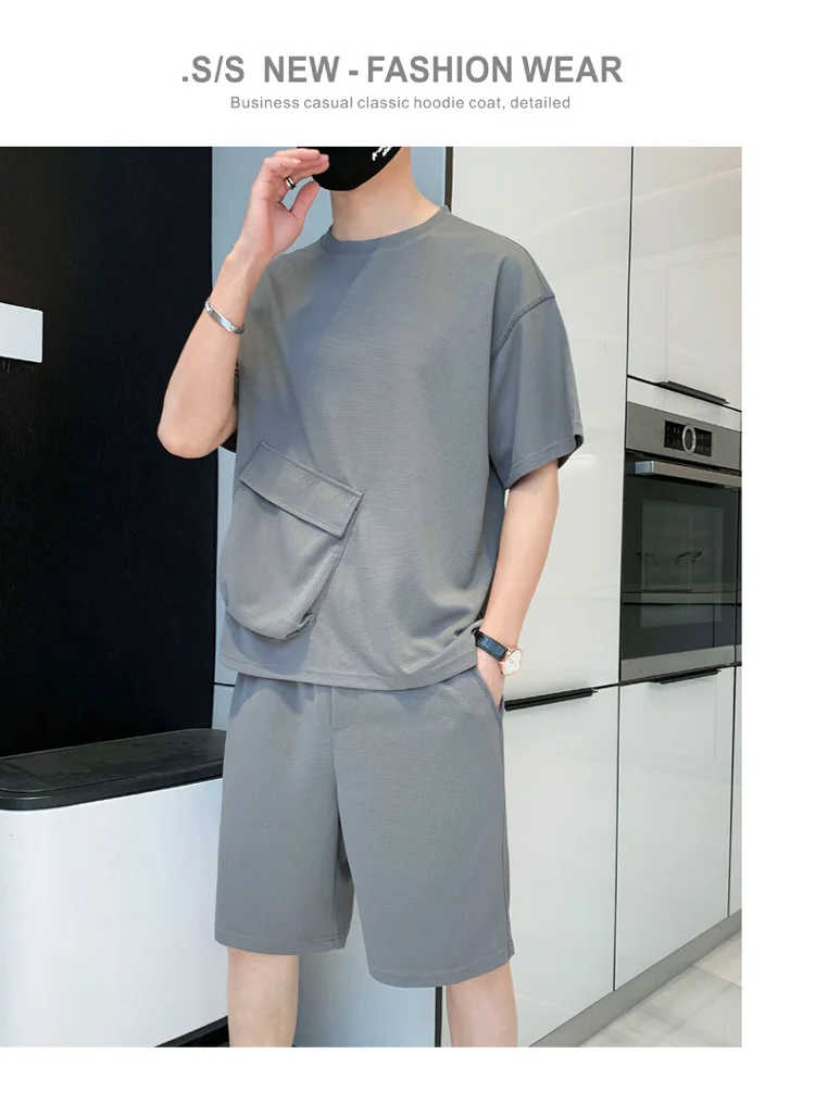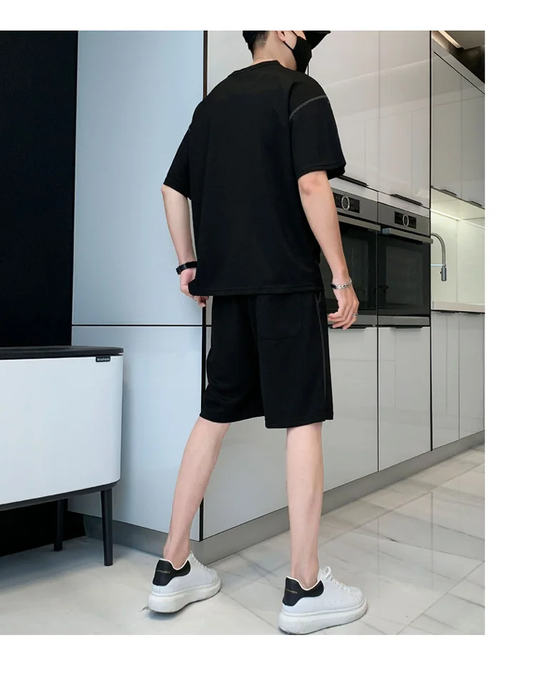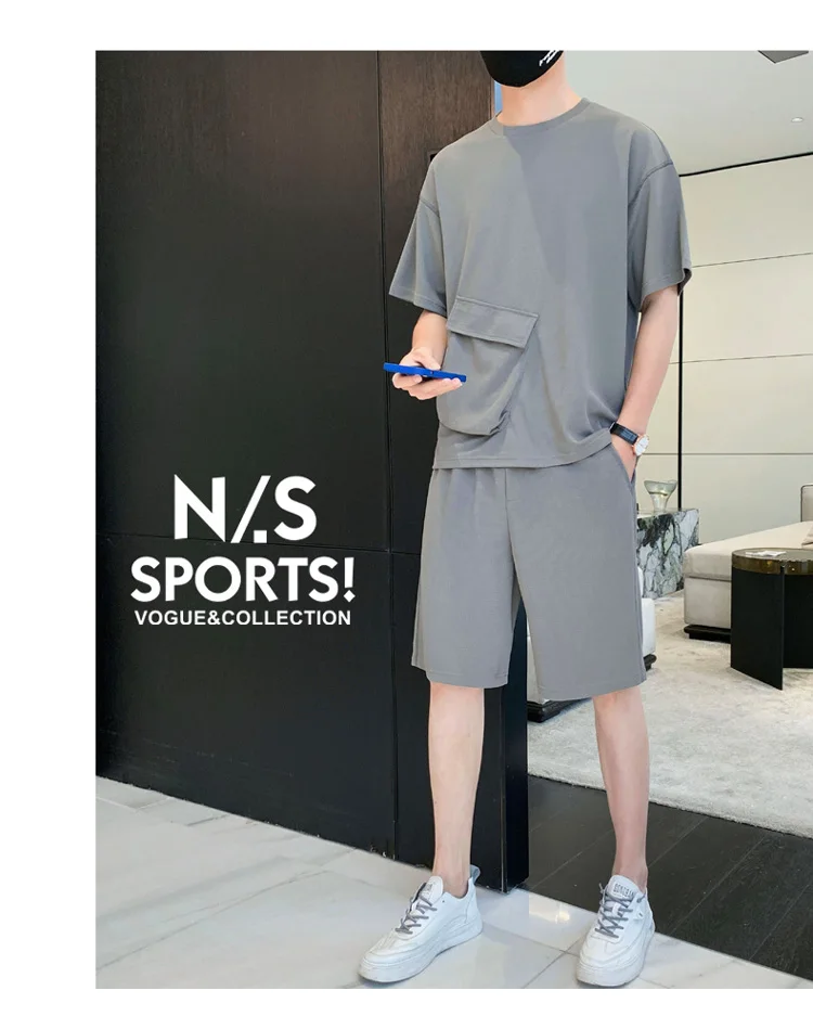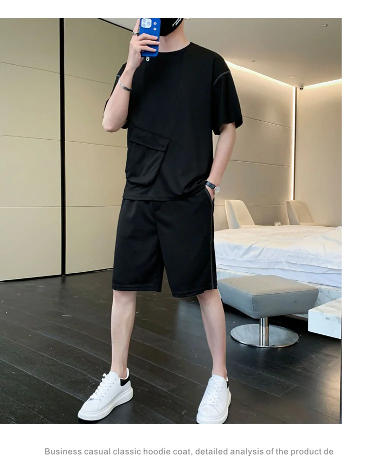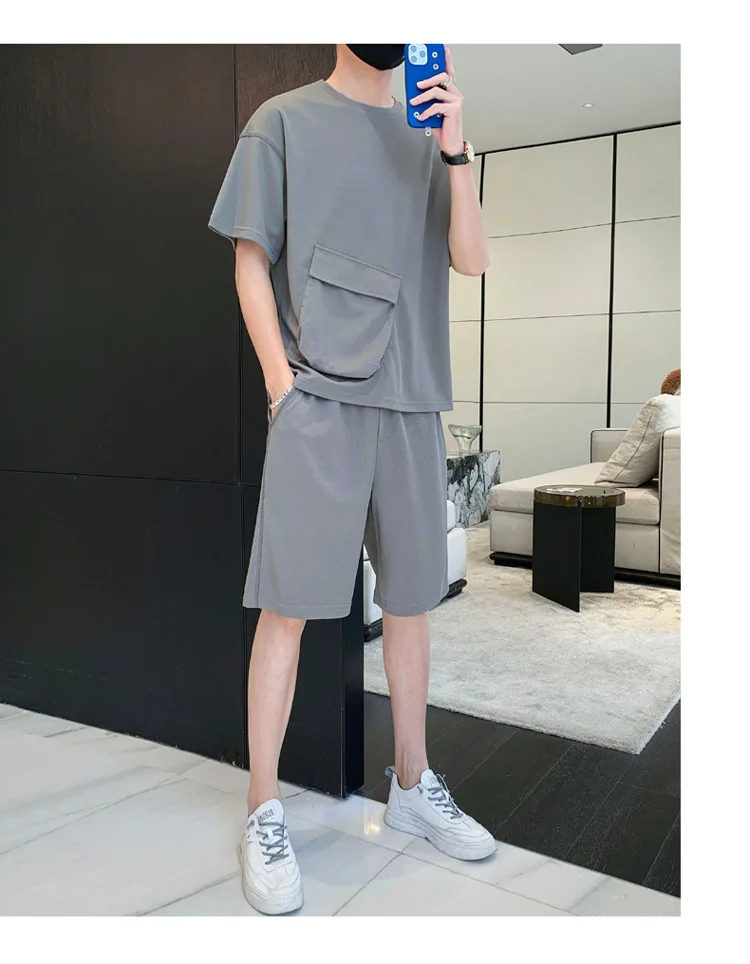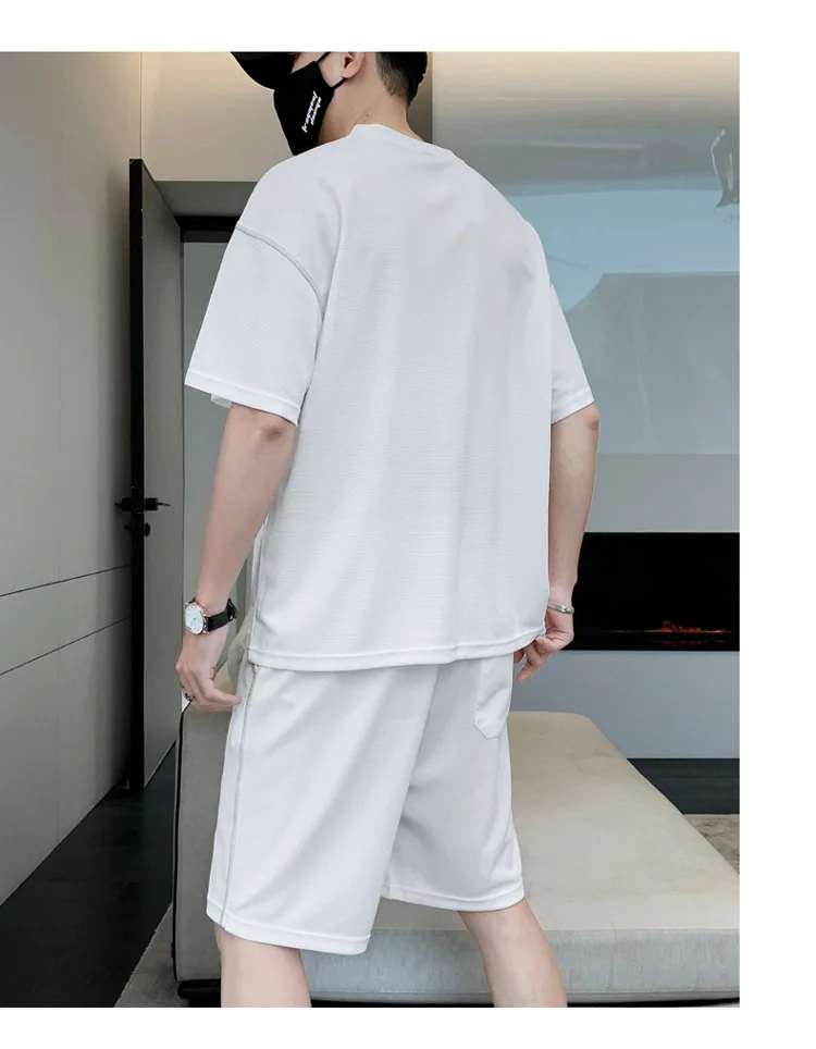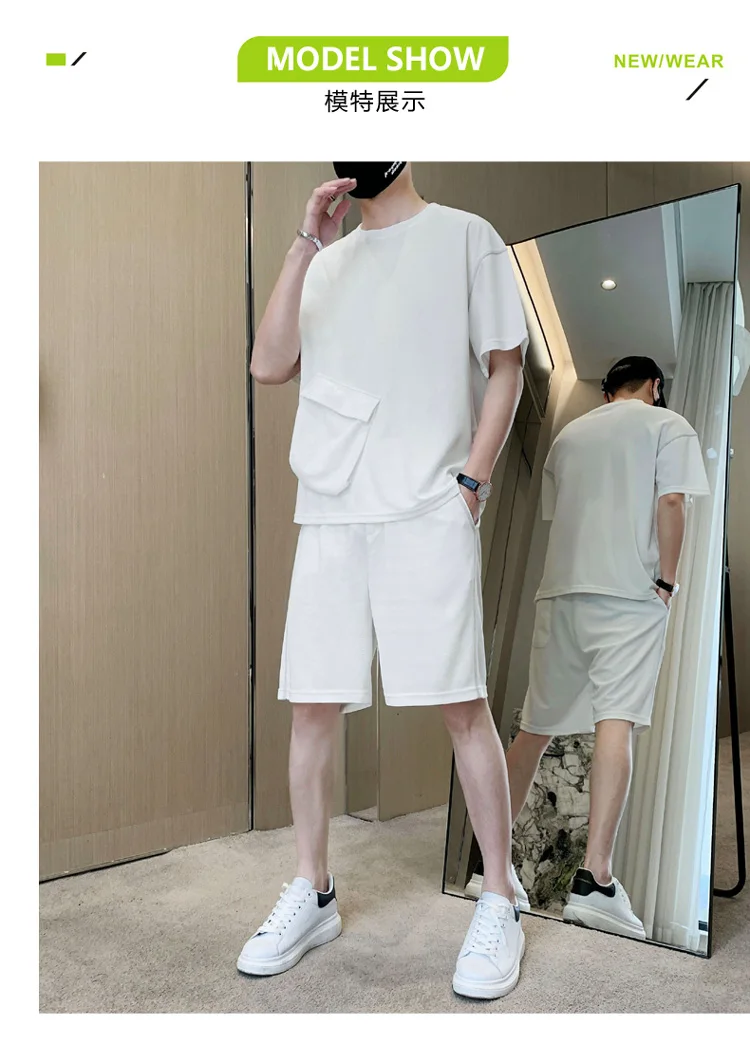 New Solid Ice Silk Men's T-shirt + Shorts Set Daily Simple Casual Tshirt Tracksuits Sports Running Sets Male Sport Suit