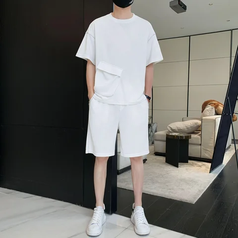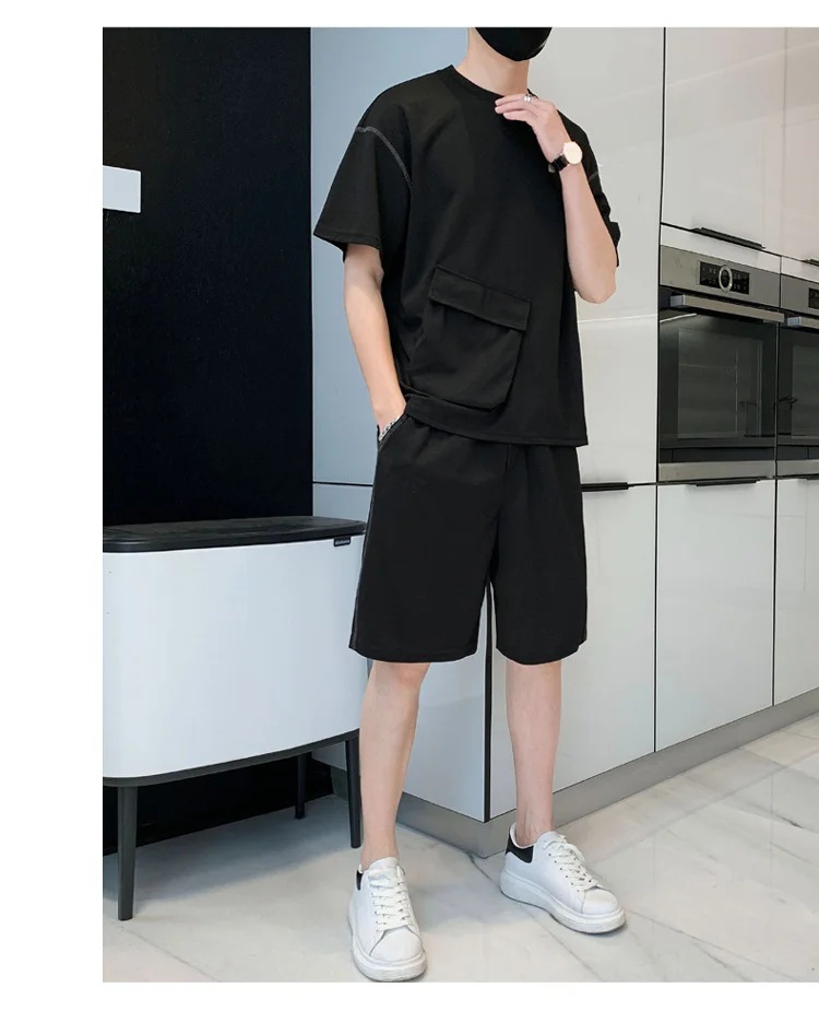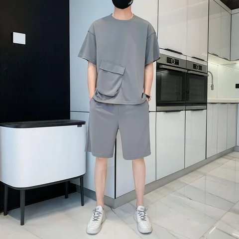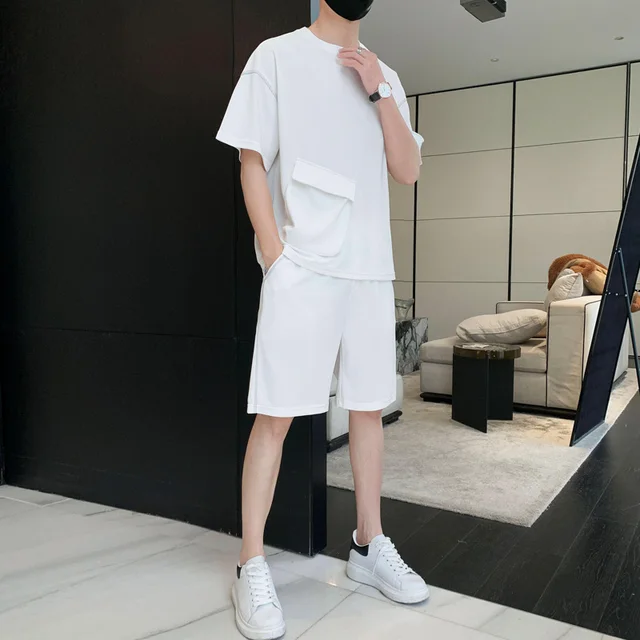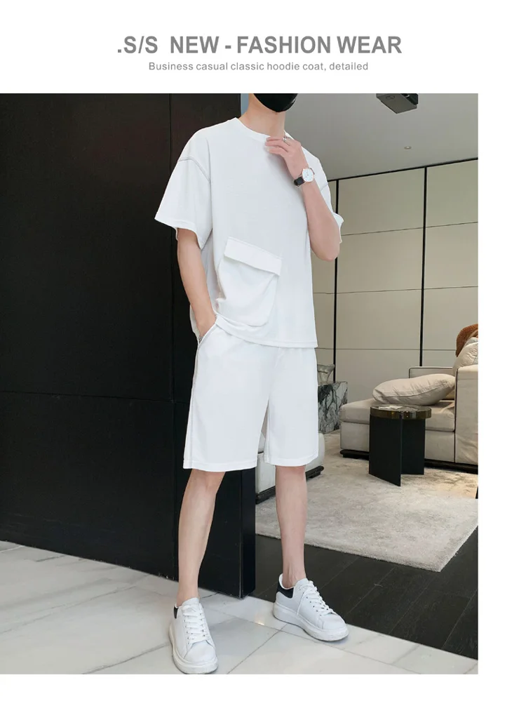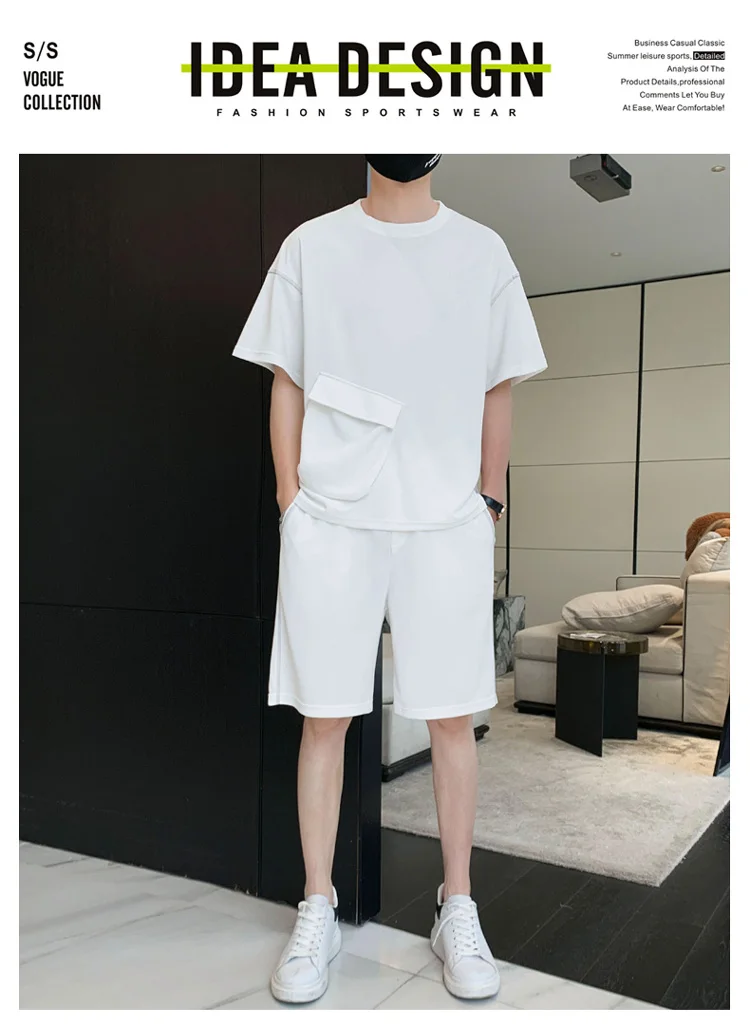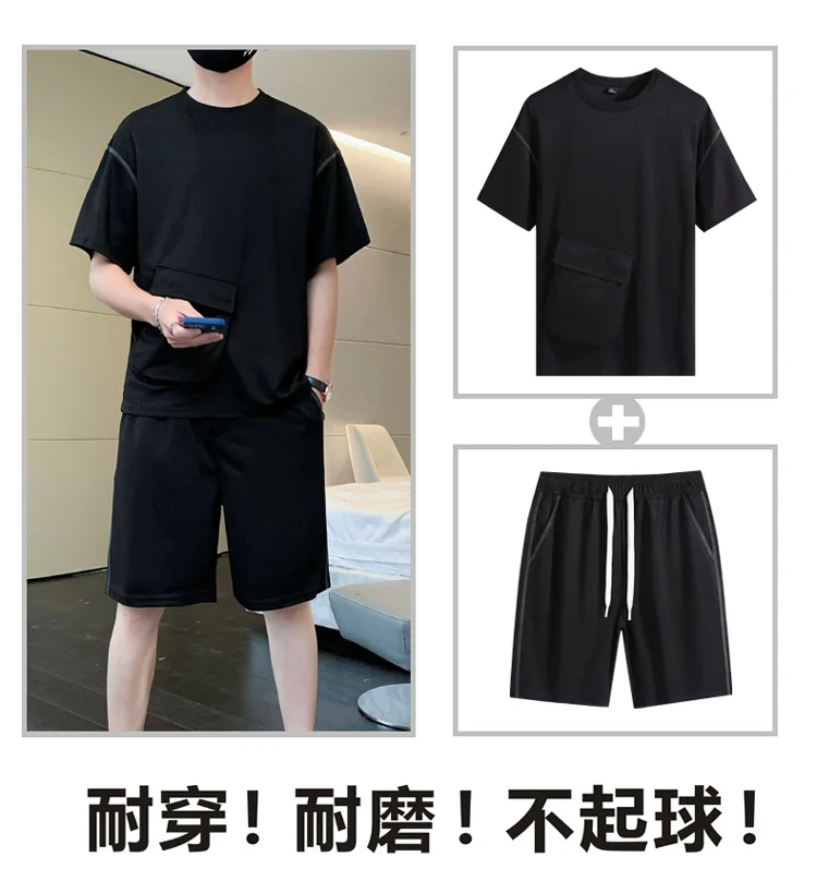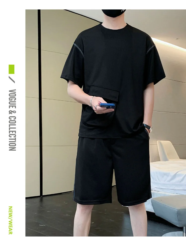 New Solid Ice Silk Men's T-shirt + Shorts Set Daily Simple Casual Tshirt Tracksuits Sports Running Sets Male Sport Suit