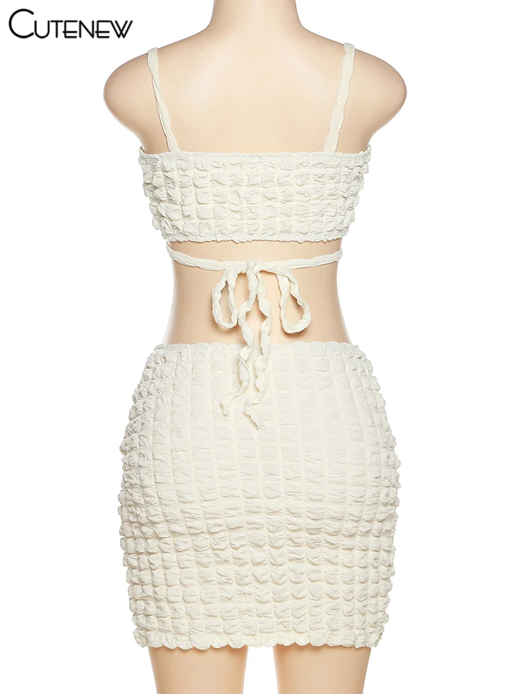 Summer Casual Two Piece Set Women Sexy V-Neck Cross Bandage Strap Slim Tops+Skinny Mini Skirt Matching Lady Streetwear