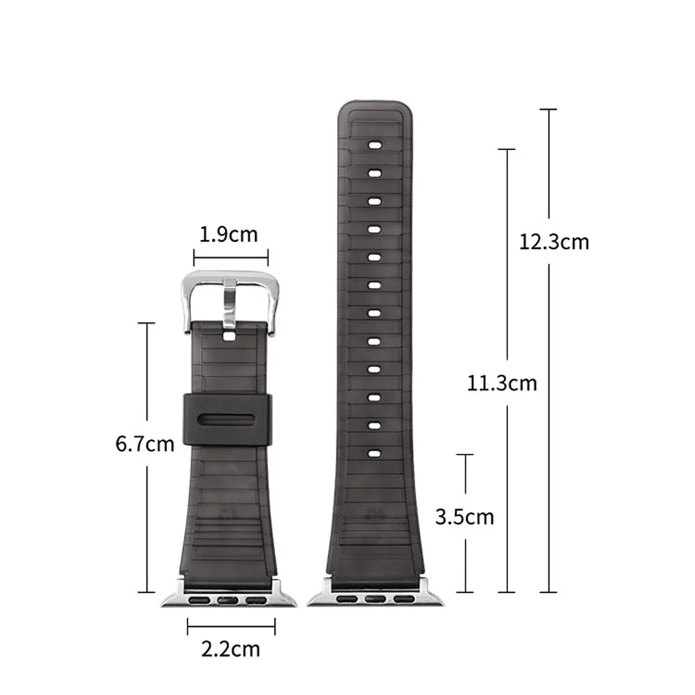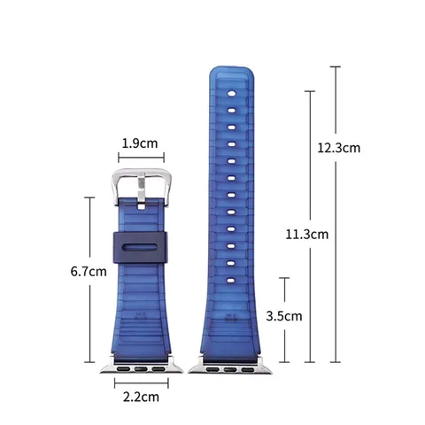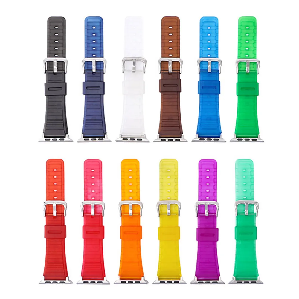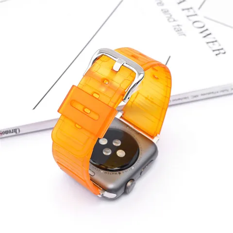 Product Description: Applicable Model: for Apple Watch iWatch 1 2 3 4 5 6 SE Watchband Size: 38mm 40mm 42mm 44mm Watchband Material: TPU Watchband Color: Transparent, Black, Brown, Blue, Royal blue, Green, Red, Yellow, Orange, Blue green, Pink, Purple Watchband Length: 12.3+6.7cm Buckle Material: Stainless Steel Buckle Color: Silver Product weight: 0.03kg Package included: Watch Band*1, (watch not included)