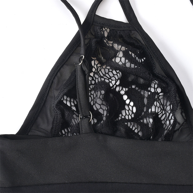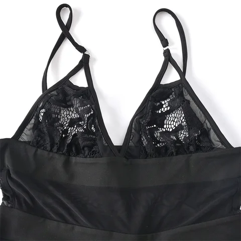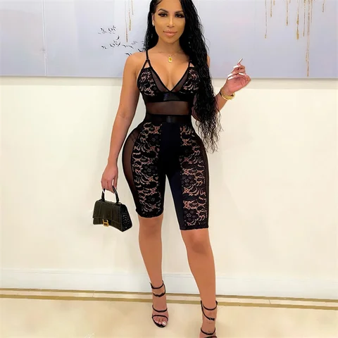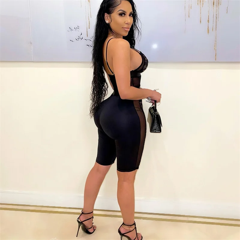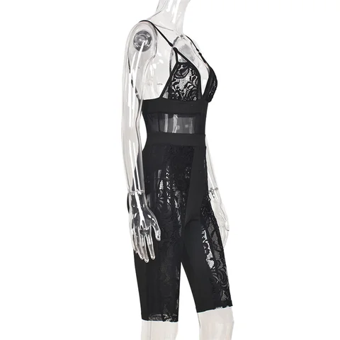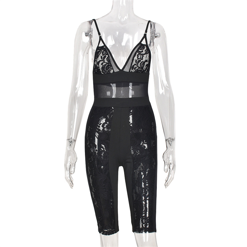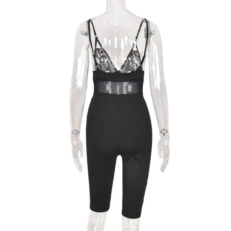 Black Lace Mesh Patchwork Playsuits Top Women Spaghetti Strap High Waist Backless Hollow Out V-neck Rompers 2022