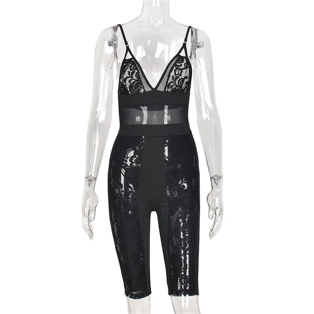 Sexy Black Lace Mesh Patchwork Playsuits Top Women Spaghetti Strap High Waist Backless Hollow Out V-neck Rompers 2022