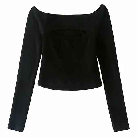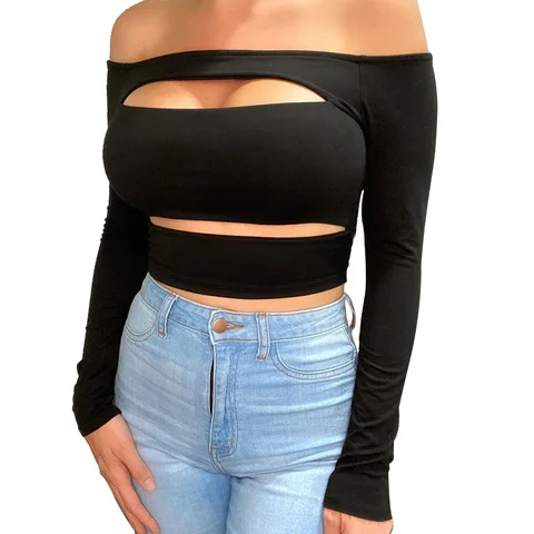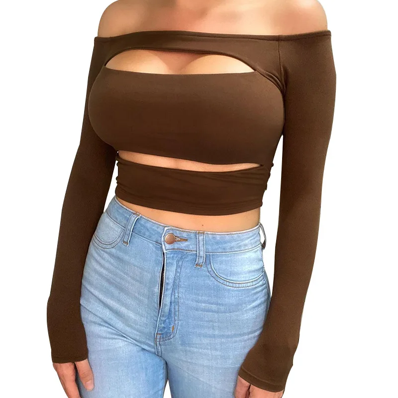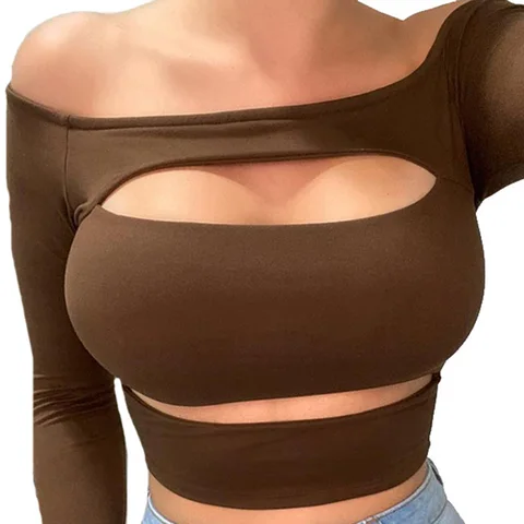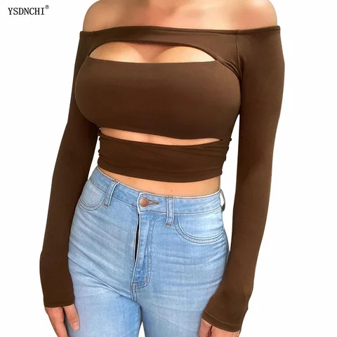 Crop Top Black Shirts Sexy Slash Neck Short Femme Club Women Harajuku 2021 Spring Summer Long Sleeve Tight Gray Coffee
