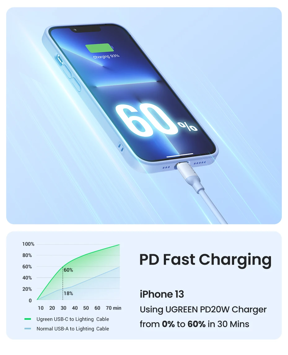 3>>>PD 20W fast charging: ugreen USB lightning cable is integrated with speedy charging mode and trickle charging, mode, which can feed your iPhone from 0%-60% only within 30 mins, while after 80%, trick charging will start to protect your iPhone from over-charging or over-current.