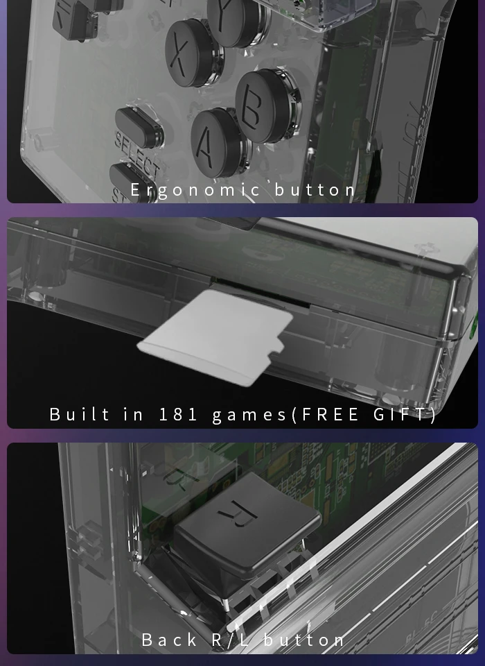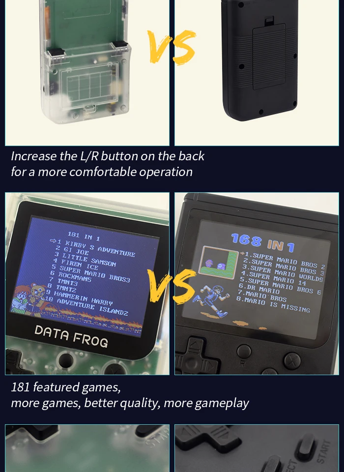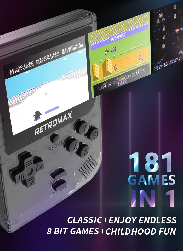 Classic design, 3.0-inch screen design, built-in 181 different games, let you go back to your childhood and enjoy family entertainment time. (contact the seller to get the game list)