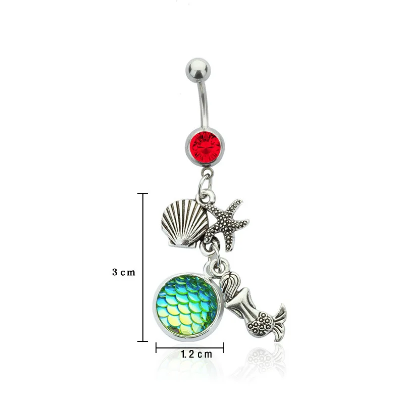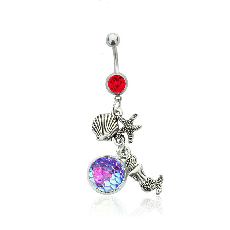 Body Piercing Jewelry with Silver Color Red Crystal Rainbow Scales Mermaid Shaped Dangle Belly Button Ring for Unisex