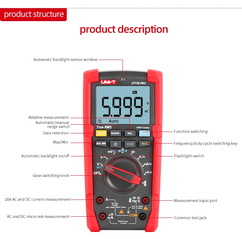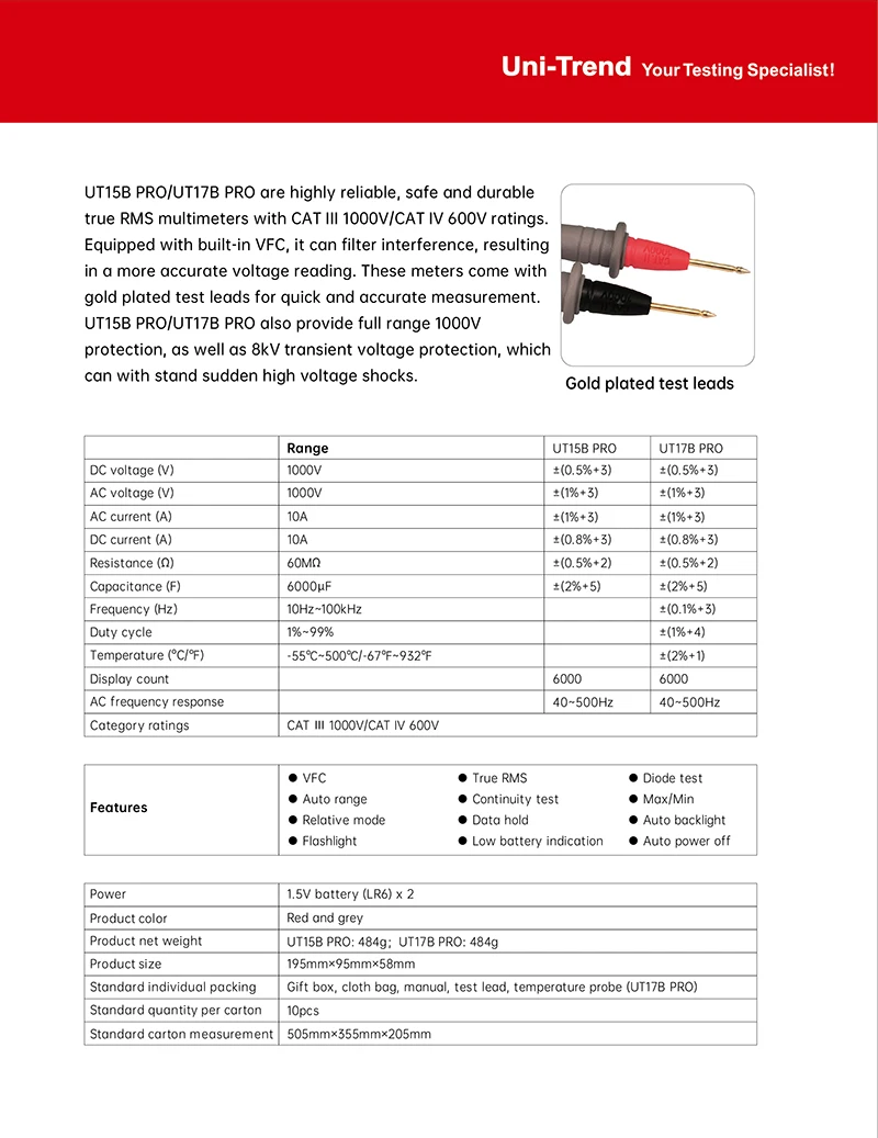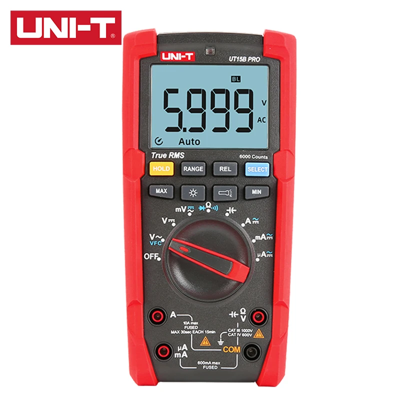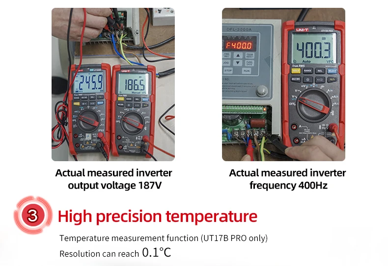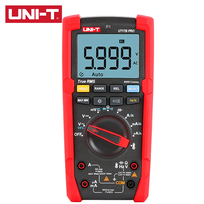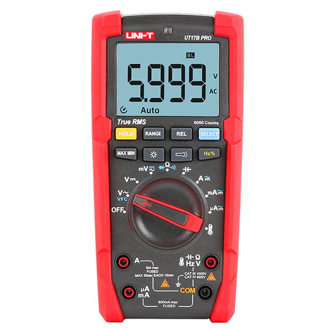 UT15B PRO / UT17B PRO is a high-reliability true RMS digital multimeter. The product has a built-in VFC anti-jamming start mode, which can filter out the carrier frequency interference or distortion voltage signal superimposed by the sine wave, and stably measure the output voltage of the inverter. And equipped with a hand-automatic backlight induction self-starting function. UT17B PRO has added frequency and duty cycle modes, which can switch frequency and duty measurement arbitrarily between DC / AC. It is also equipped with a temperature measurement function with a resolution of 0.1 ℃. The full range of functions of this series of products realizes the misdetection protection of up to 30KVA energy, ensuring users are safer and more reliable in operation, and obtained CETLus certification according to the CAT III 1000V / CAT IV 600V safety level.