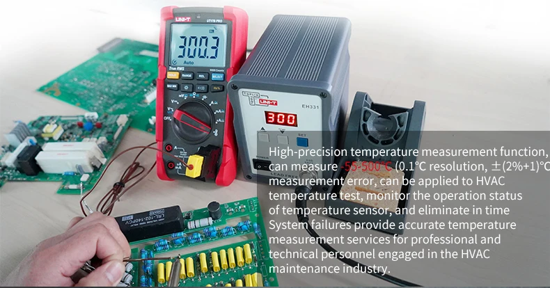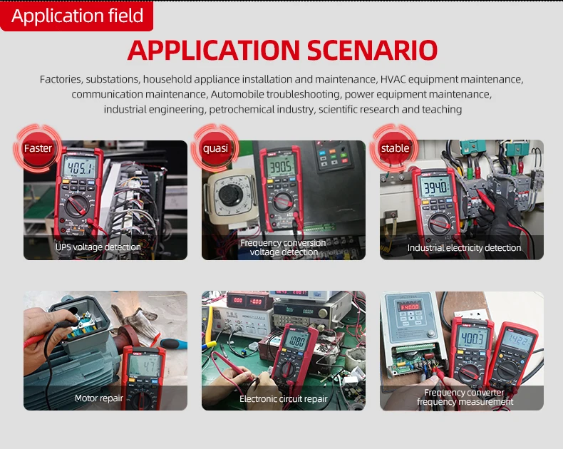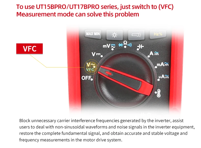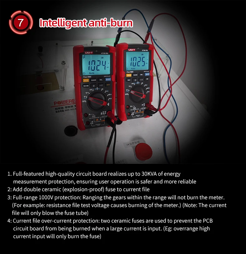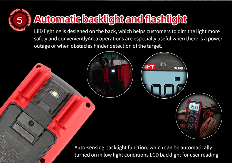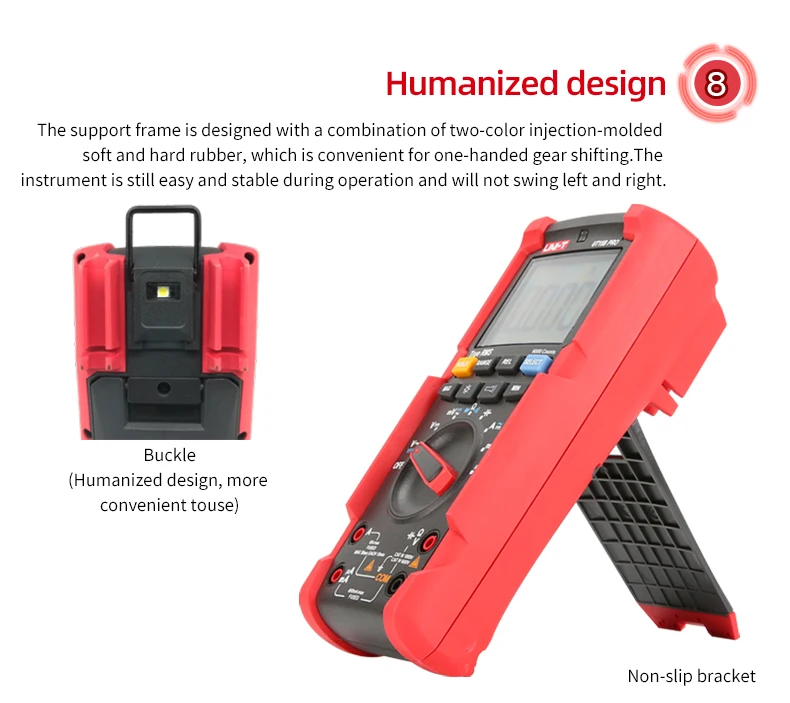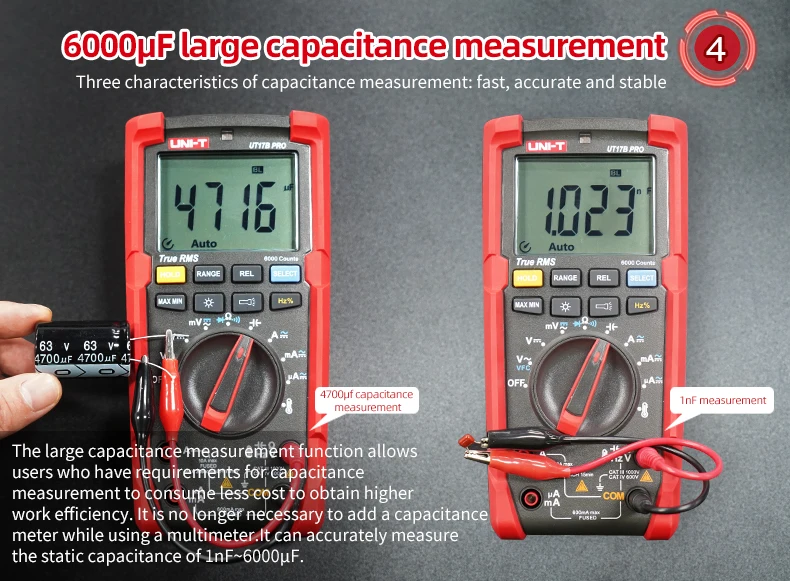 UT15B PRO / UT17B PRO is a high-reliability true RMS digital multimeter. The product has a built-in VFC anti-jamming start mode, which can filter out the carrier frequency interference or distortion voltage signal superimposed by the sine wave, and stably measure the output voltage of the inverter. And equipped with a hand-automatic backlight induction self-starting function. UT17B PRO has added frequency and duty cycle modes, which can switch frequency and duty measurement arbitrarily between DC / AC. It is also equipped with a temperature measurement function with a resolution of 0.1 ℃. The full range of functions of this series of products realizes the misdetection protection of up to 30KVA energy, ensuring users are safer and more reliable in operation, and obtained CETLus certification according to the CAT III 1000V / CAT IV 600V safety level.