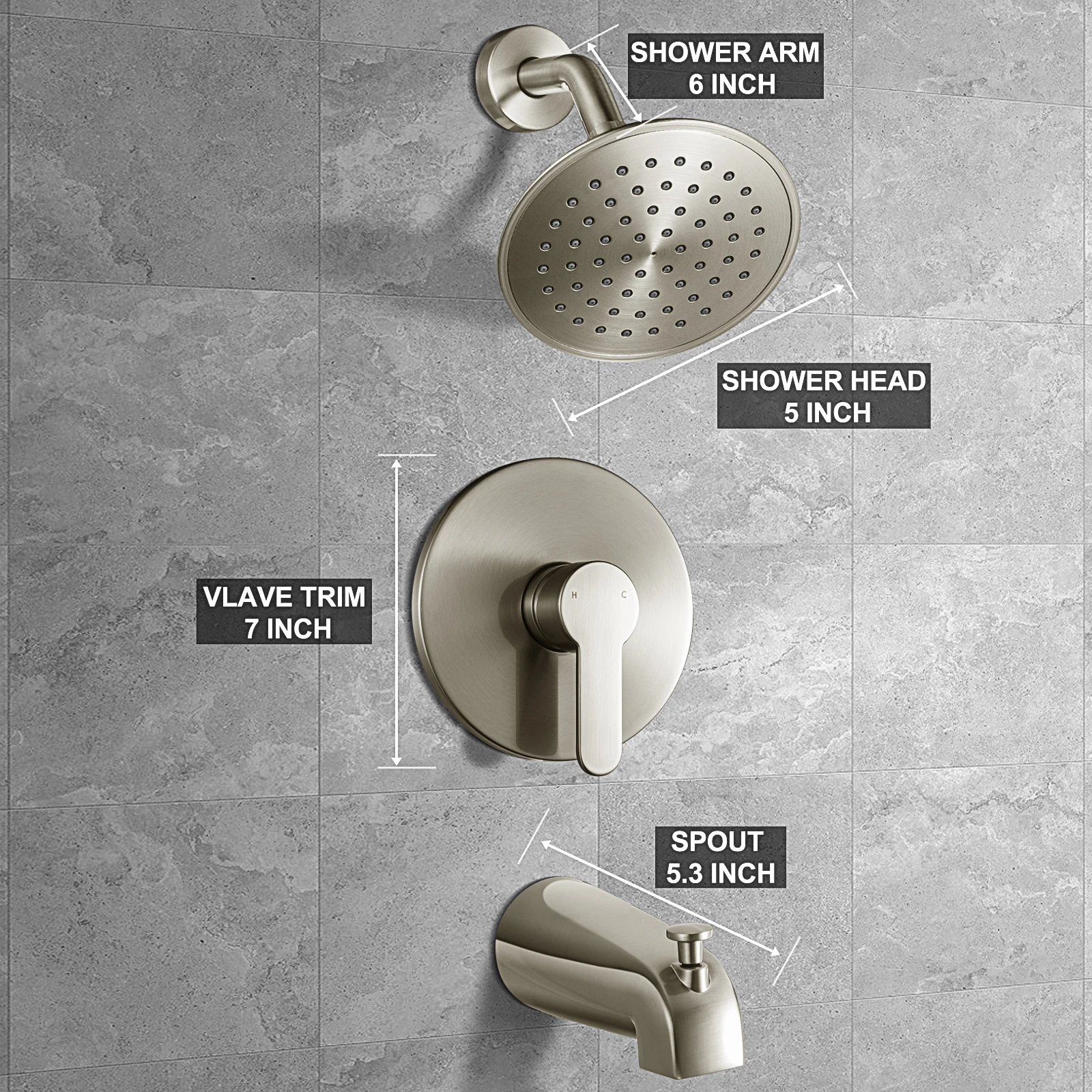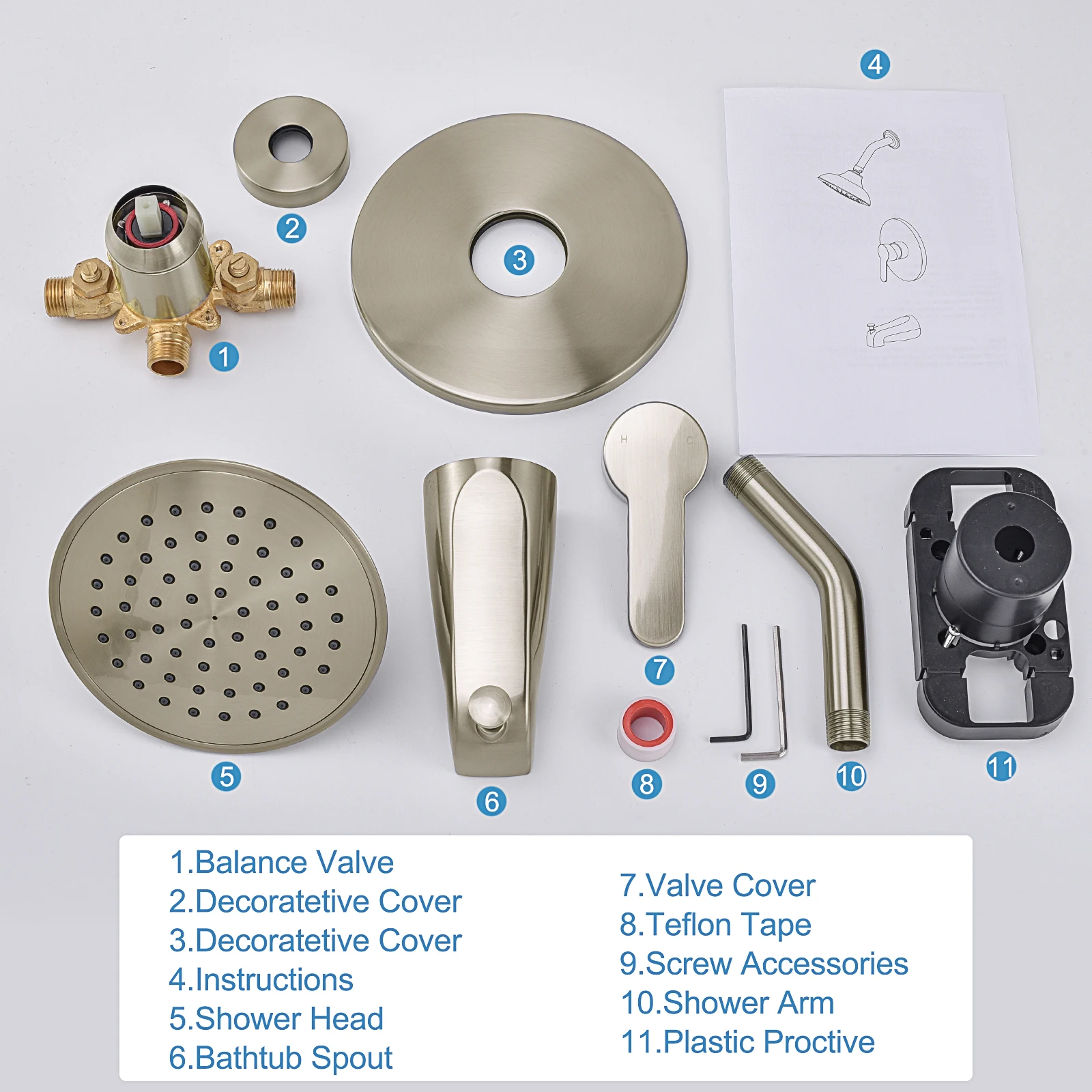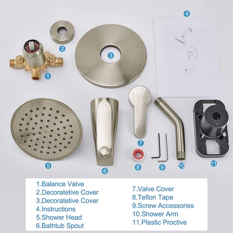 Package include:1.Balance Valve 2.Decoratetive cover *2 3.Shower head 4. Bathtub Spout 5. Valve Cover 6.Telflon Tape 7. Screw Accessories 8.Shower Arm 9. Plastic Proctive 10.Insturctions