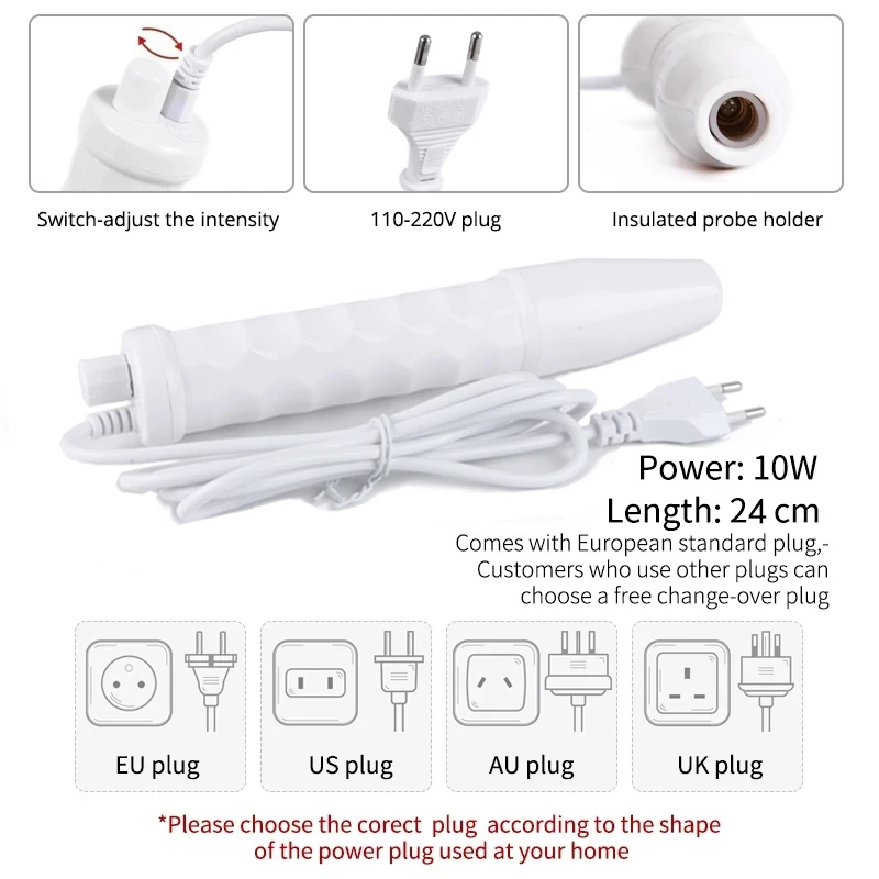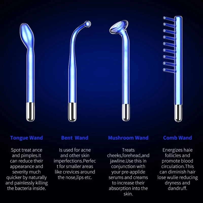 2:4 ELECTRODES PREPARED FOR YOU — 4 glass electrodes apply to various body part : spoon electrode, extra way to eliminate acne and treat pimple; mushroom electrode, treat the forehead and cheek; bent electrode, treat the nasal fossa and reduce the appearance of acne; Y shape electrode, for the shoulders and neck area; comb electrode, to stimulate hair follicles and diminsh hair loss.