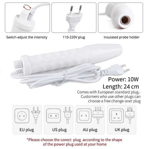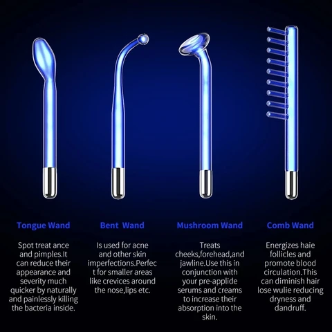 Features specialized glass applicators like a Y-shaped wand that can conveniently be applied to areas like your arms and neck or a Rod applicator that works with broader areas like cheeks and the forehead. A supercharged comb wand is perfect to energize the scalp and hair.