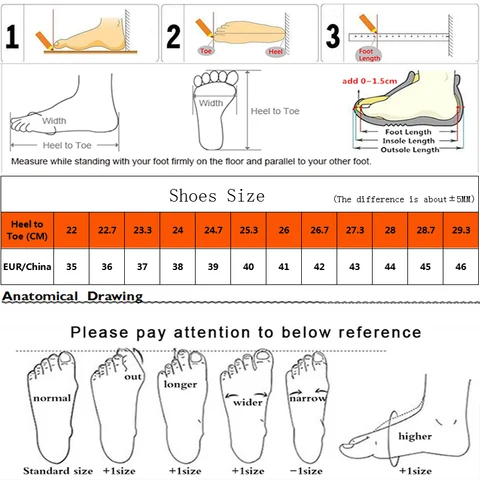 3.Please do not measure the insole length,it is different from the foot length.