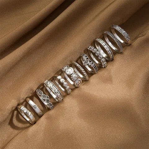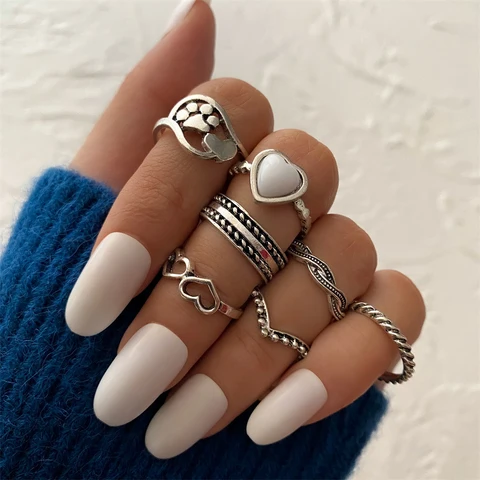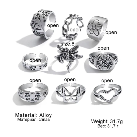 • Vintage Silver Heart Chain Butterfly Hot Sale Rings Set for Women Men Punk Poker Flower Finger Rings 2021 Trend Jewelry