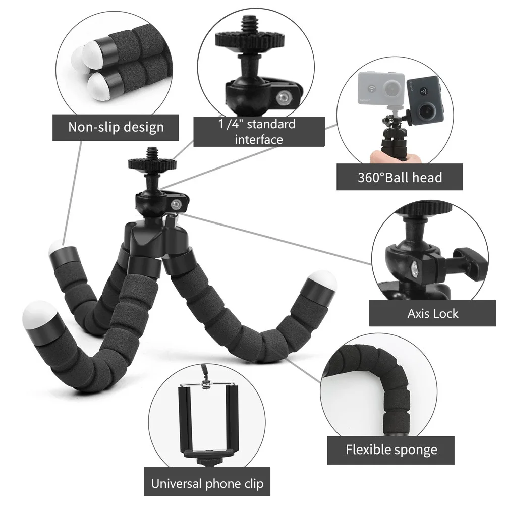 Bendable tripod. Adjustable octopus style legs help to capture clean shots from any angle even in the move. You can place the tripod on a plane or slope, or wrap it on a small tree and post.