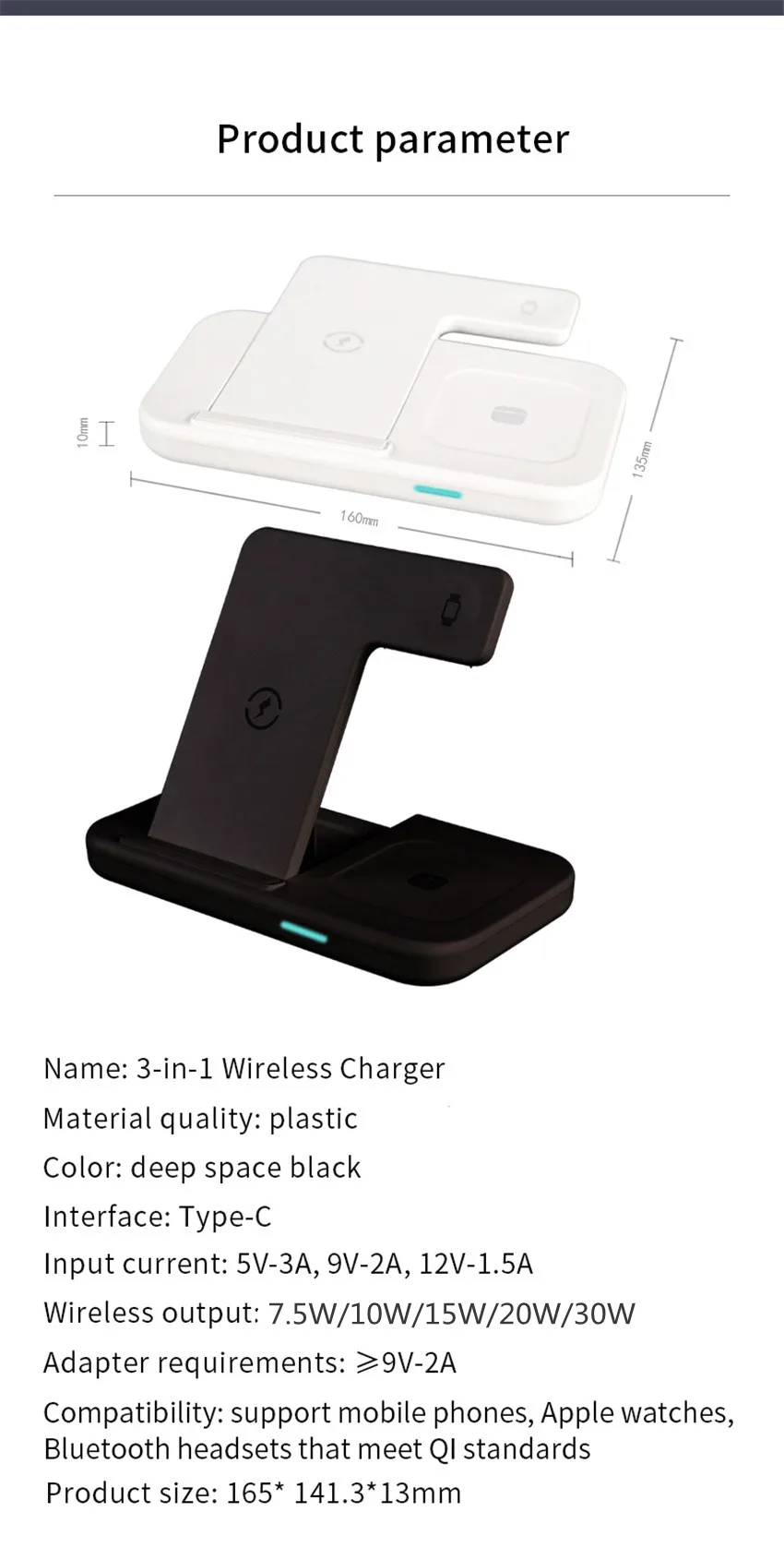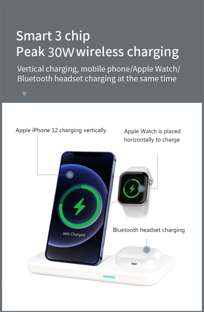 [Wide Compatibility]: Wireless charging station can charge your for apple iwatch 2/3/4/5/6/SE/7【NOT for Samsung Watch】5W wireless charging pad output for Airpods Pro/2/3 Wireless Charging Case and other Qi-enabled devices like true wireless earbuds; 7. 5/15W fast charging for apple products iPhone 13/13 Pro/13 Pro Max/13 Mini/12/12 Pro/12 Pro Max/12 Mini/SE 2/11/11 Pro/11 Pro Max/XS/XS MAX/XR/X/8/8 Plus; 15W/20W/30W fast wireless charging for Samsung Galaxy S21, S20, S20+, S20 Ultra, S10, S10 Plus, S10E, S9 , S9Plus, Note 20, Note 10, Note 9, Note 8, S8, S8Plus, S7, S7 edge, S6 edge , Note 5; ( Note: 3 devices When charging,please use a 9V-2A QC3.0 adapter.) Not included