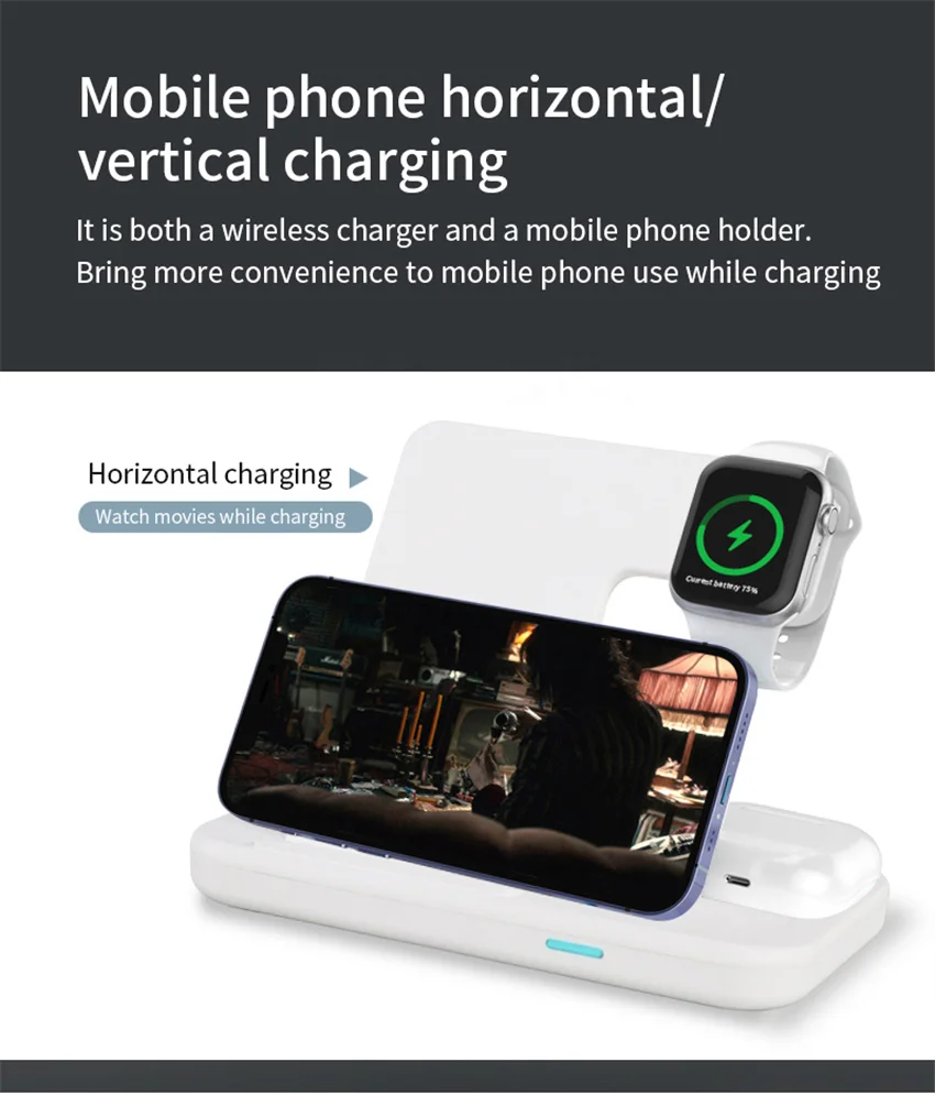[3 IN 1 WIRELESS CHARGER]: Wireless charger stand for Samsung vivo htc etc all fast charging Qi-Enabled Phones, for Apple Watch 7 6 SE 5 4 3 2, for AirPods Pro at the same time, only one USB-C cable cable, to make your desktop and nightstand more neat.