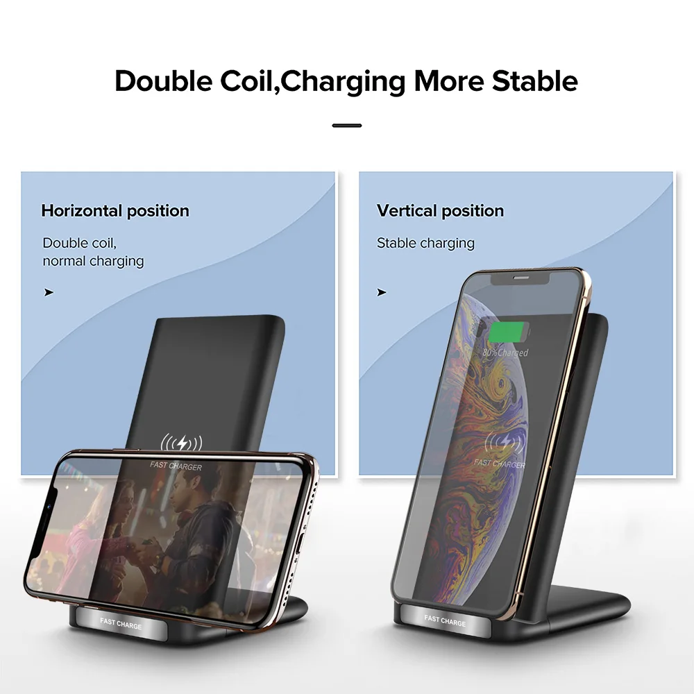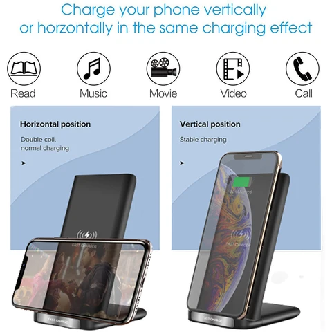 DUAL VIEWING ANGLES- 2-coil wireless pad charges your phone vertically or horizontally for the most ideal view and support when watching videos, listening to music, playing games, and more, perfect accessory for your phone at any places like office, bedroom, living, etc.