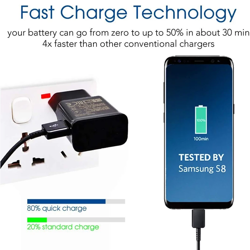 - Fast & Sync: Fast Charger Kit Charges Samsung Phones and Tablets with USB 2. 0 Ports At Max Speed. This Charger Set Charges All Other Non-Fast Devices As Well. It Will Charge USB 2. 0 Phones and Tablets That Use Type C Cable at Their Normal Speed. Offers High-Speed Transfer of 480 Mbps Designed for Charging and Syncing Smartphones, Tablets, and Bluetooth Speakers.