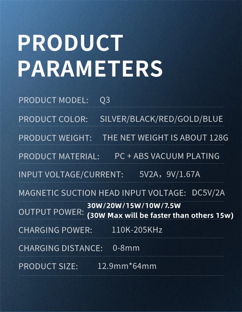 Charging power: 30W/20W/15W/10W / 7.5W / 5W (30W max will be faster than others wireless charger)
