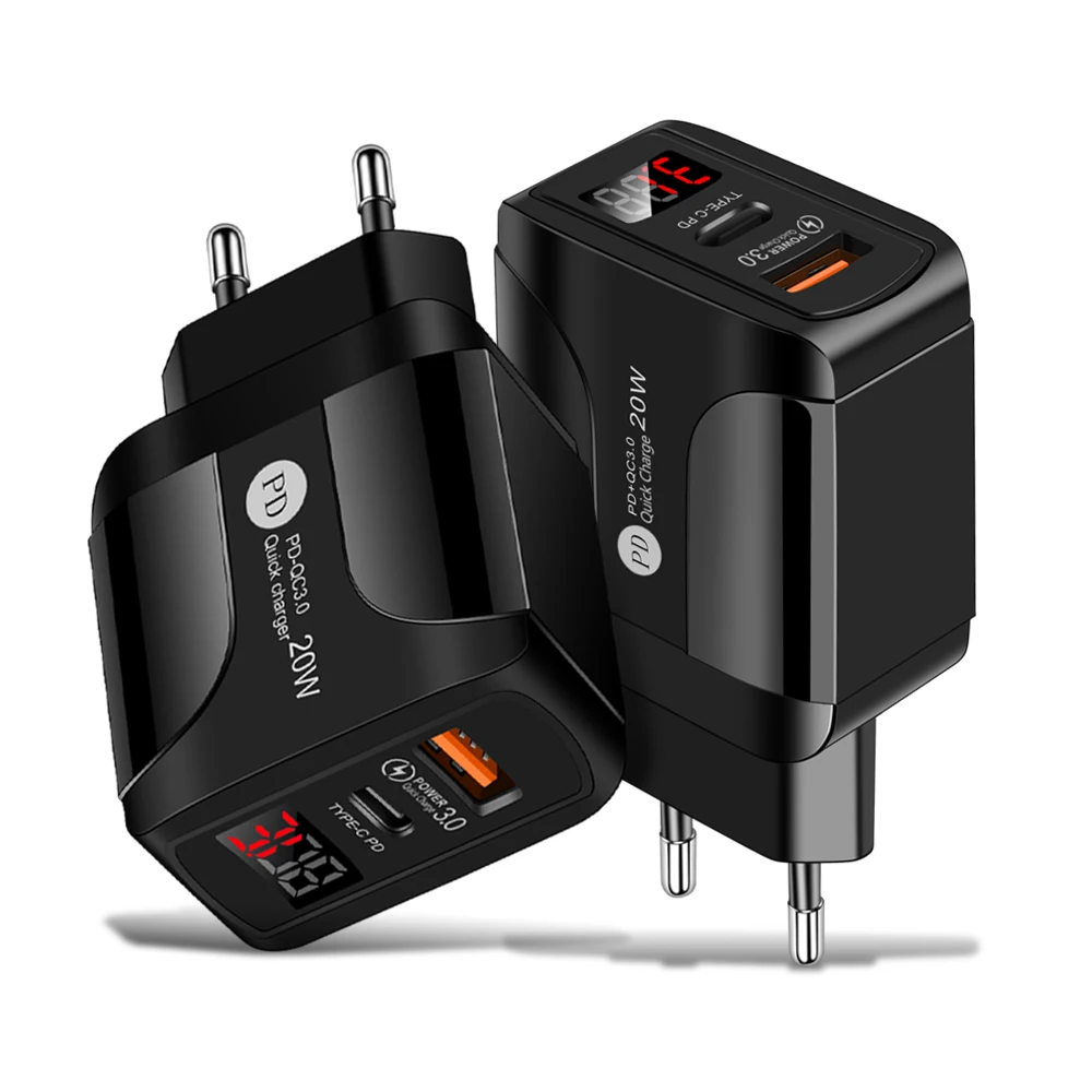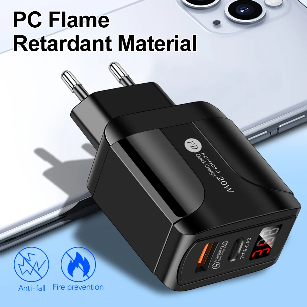 20W USB-C Quick Charger QC 3.0 Dual Ports with LED display For iPhone 12 Huawei Xiaomi Samsung Fast Phone Charge Wall Adapter