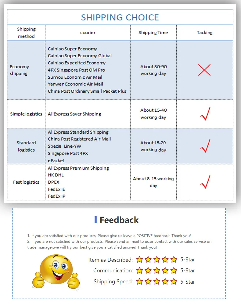 1.We offer you the cheapest pric,so there is no logistics information after the package leaves China.You can receive the package under normal circumstances.If you did not receive the package under the protection of time,please contact us,we will handle the replacement or refund for you,thank you.