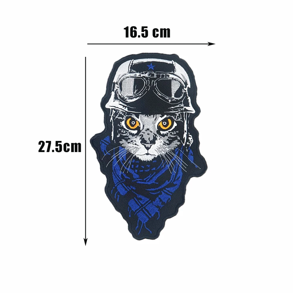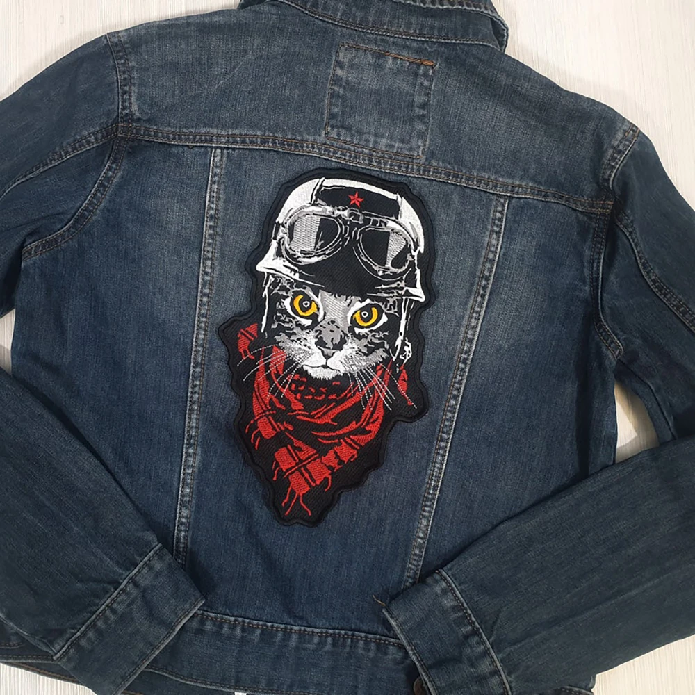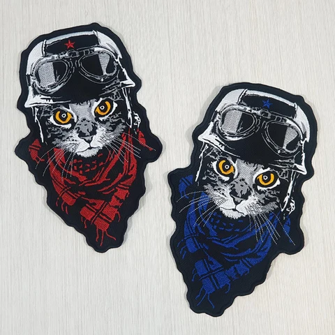 Red Blue Large Biker Kitty Embroidery Patches Pilot Cat Back Applique Iron on Motorcycle Jacket Vest DIY for Clothing Accessory