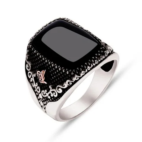 Vintage Men's Handmade Turkish Black Onyx Stone Ring Ancient Silver Color Pattern Ring Trendy Islamic Religious Muslim Jewelry Free Shipping