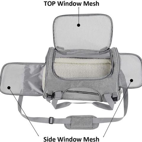 Large-capacity, strong and non-deformable inner lined with fiber rod support to ensure that the bag is not deformed. Fast and convenient travel, wide field of vision and portable. Zipper openings on both sides are convenient for pets to enter and exit, and can be easily folded. The bag is fixed on the trolley case.