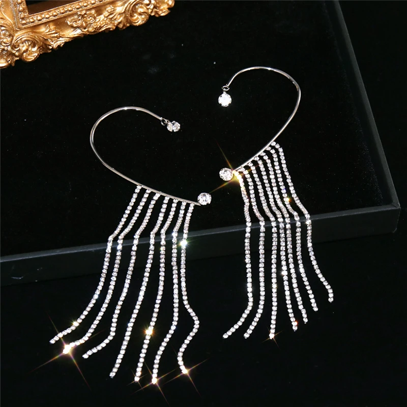 Silver Color Rhinestone Tassel Ear Clips Ear Cuff For Women Shiny Cubic Zirconia Butterfly Clip Earrings Wedding Jewelry