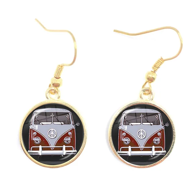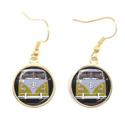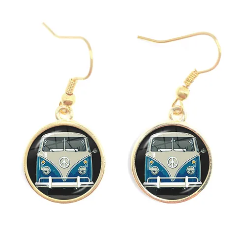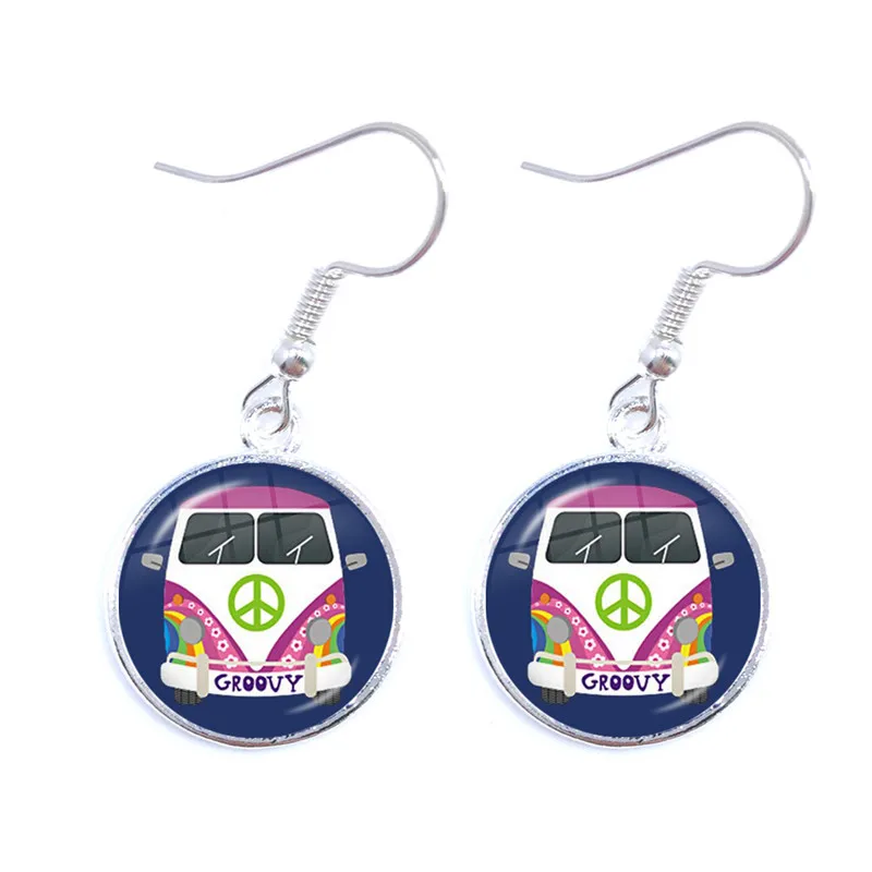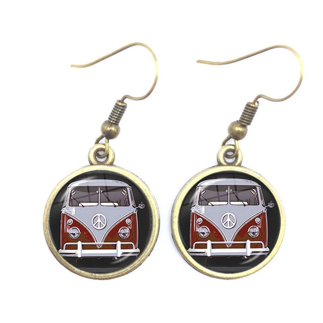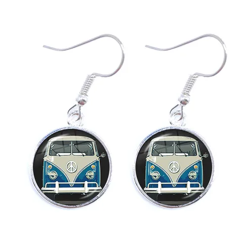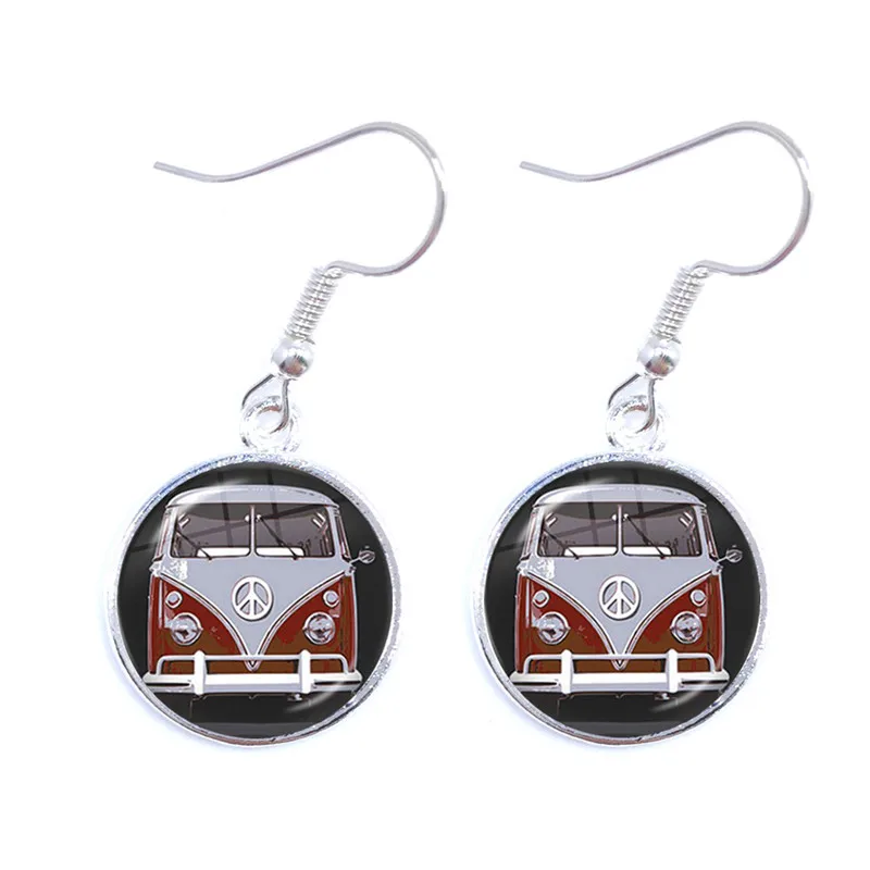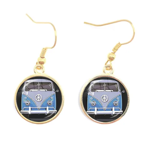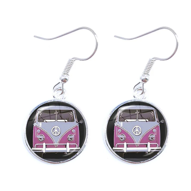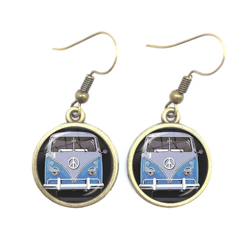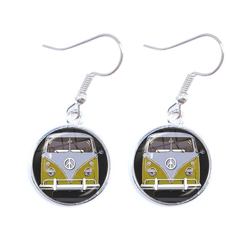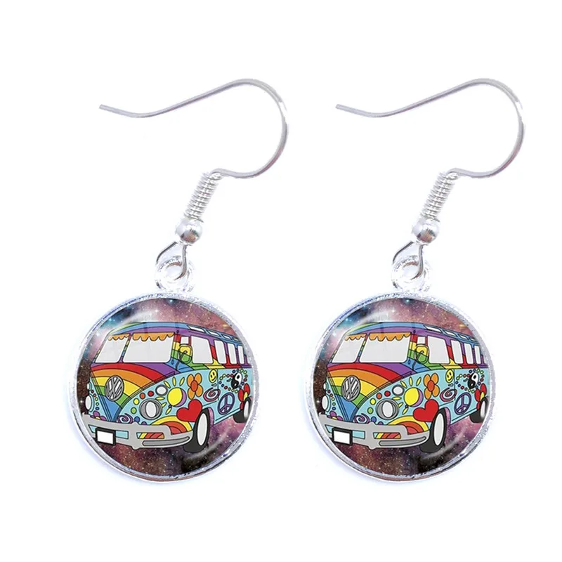 • Blue-Red-Yellow Hippie Peace Van Bus Photo Drop Earrings Retro Beach Bus Car Collectors Bus Peace Sign Jewelry For Women