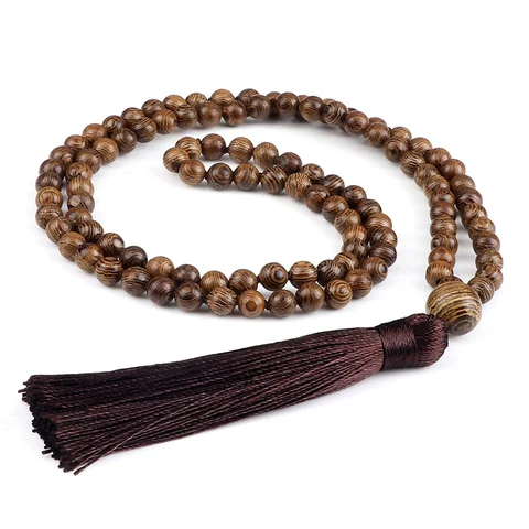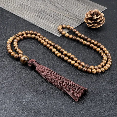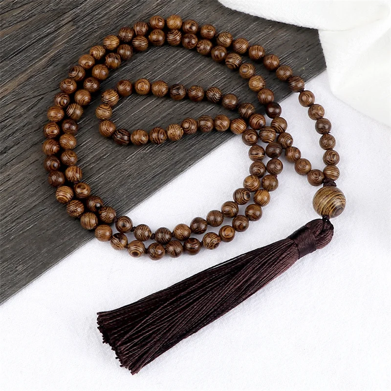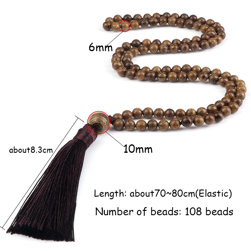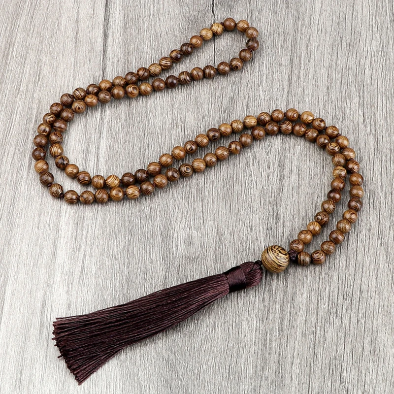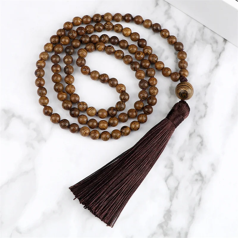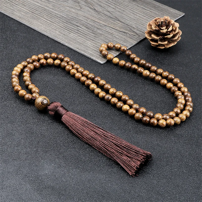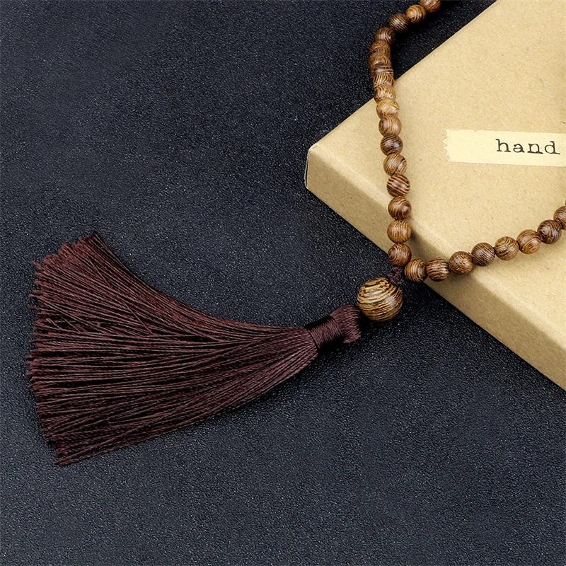 New 108 Beads Mala Necklace Meditation Prayer 6mm Wooden Bead Brown Tassel Handmade Women Men Necklace Healing Yoga Jewelry Gift