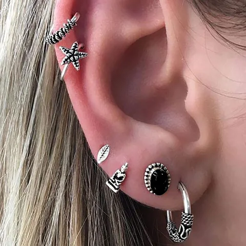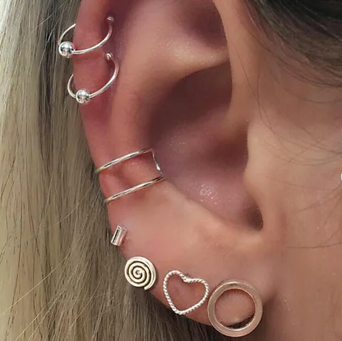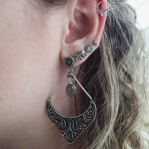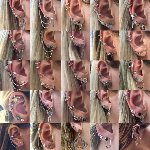 • Exquisite Vintage Earring Set for Women Punk Jewelry Vintage Silver Color Carved Geometric Pattern Round Earrings Clip