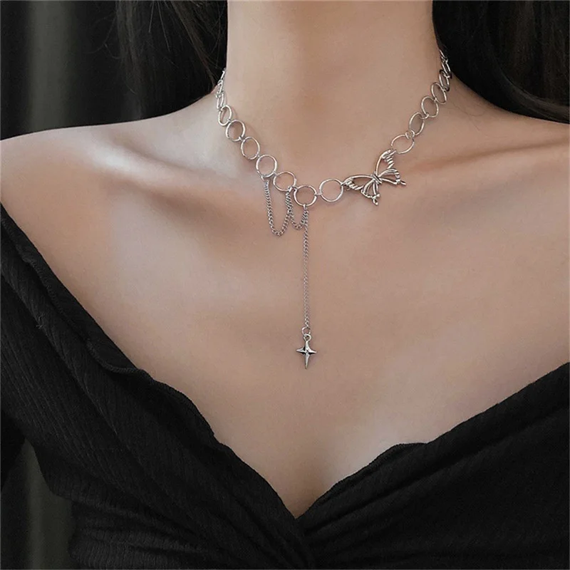 Harajuku Goth Hollow Butterfly Cross Long Tassel Punk Clavicle Chain Choker Necklace For Women Egirl Street Fashion Jewelry