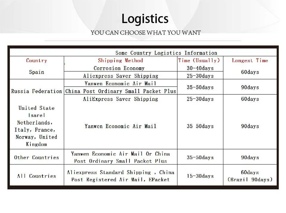 | Logistics mode | Estimated limitation of transportation (working day) | Country | District | Postcode | Weight(kg) | Gross freight |