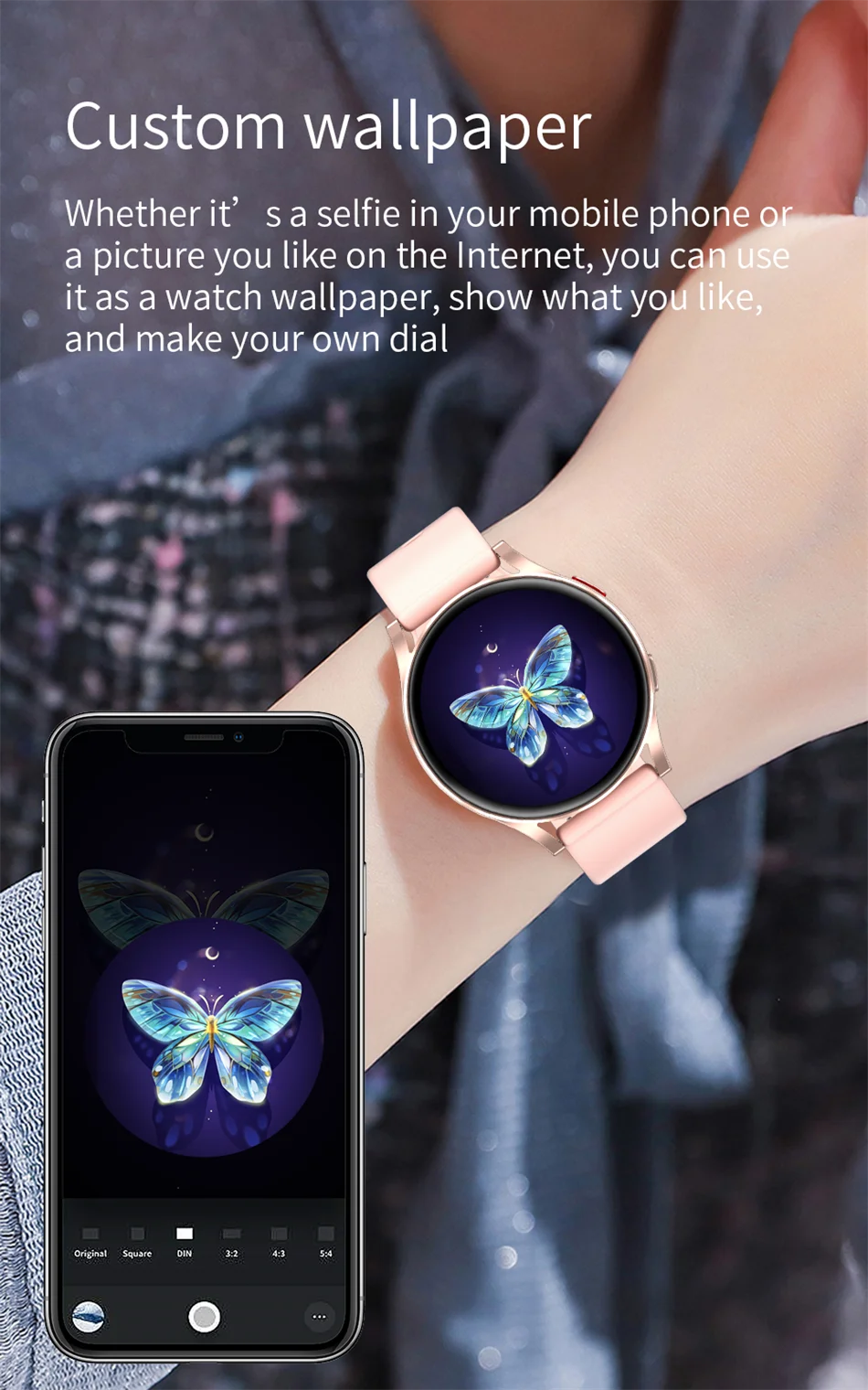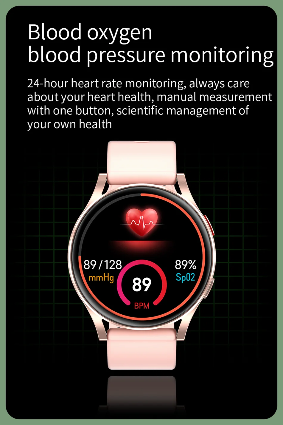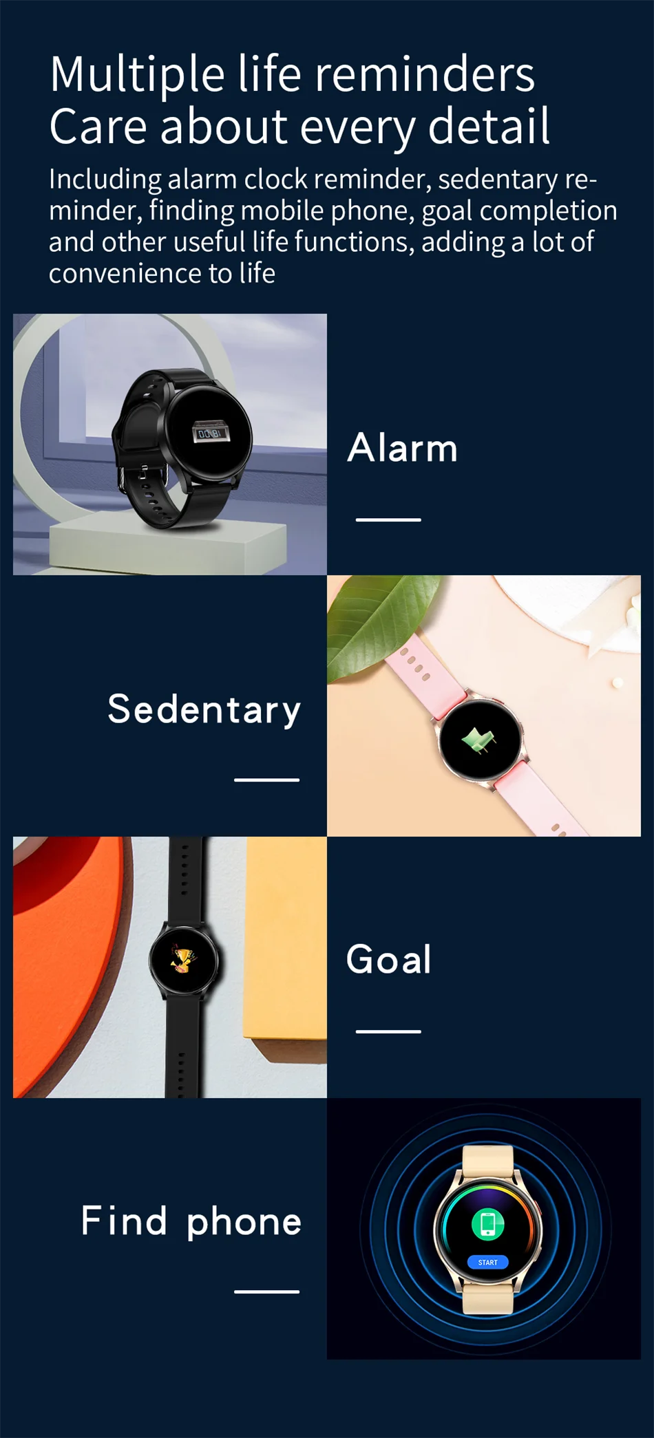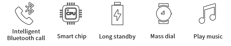 Custom wallpaper. Bluetooth call, music control, social APP message reminder, incoming call reminder, text message reminder, heart rate/blood pressure/blood oxygen monitoring, multiple exercise, alarm clock reminder, sedentary reminder, mobile phone search, music playback, stopwatch