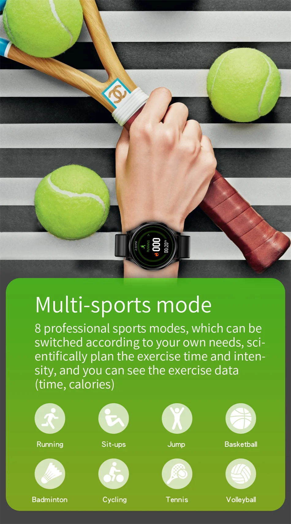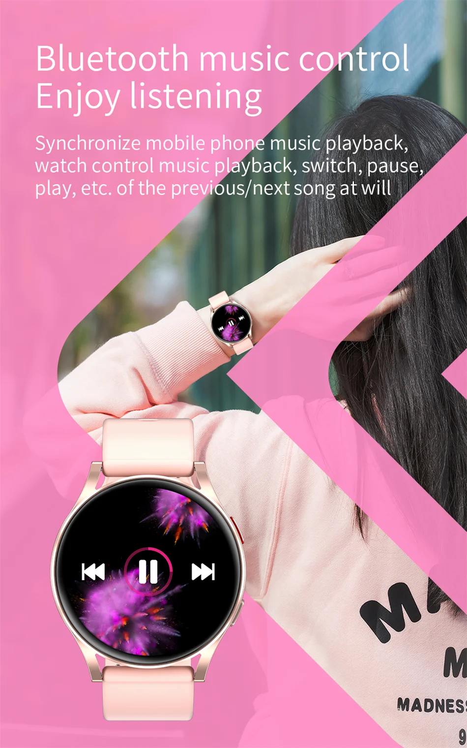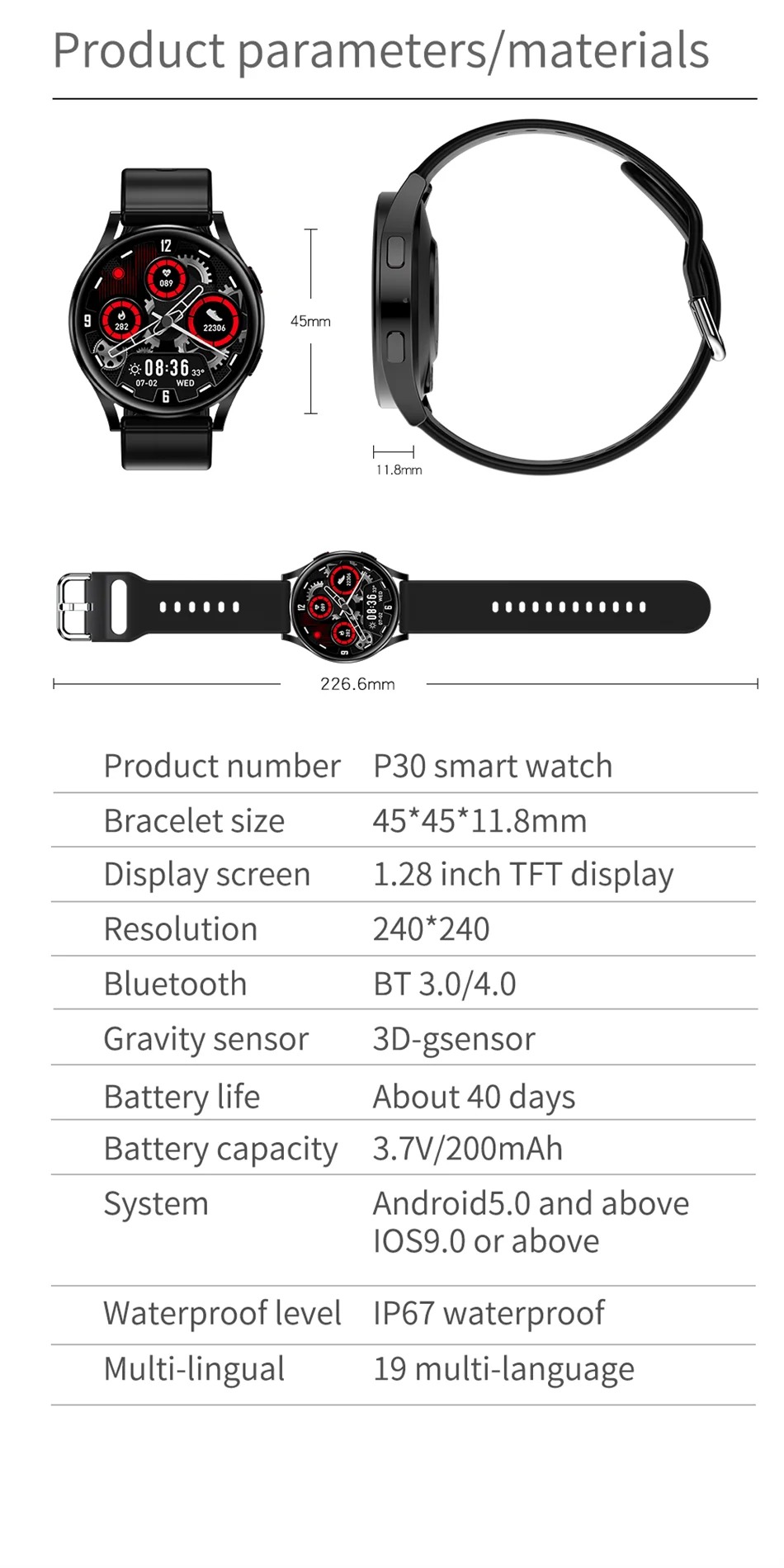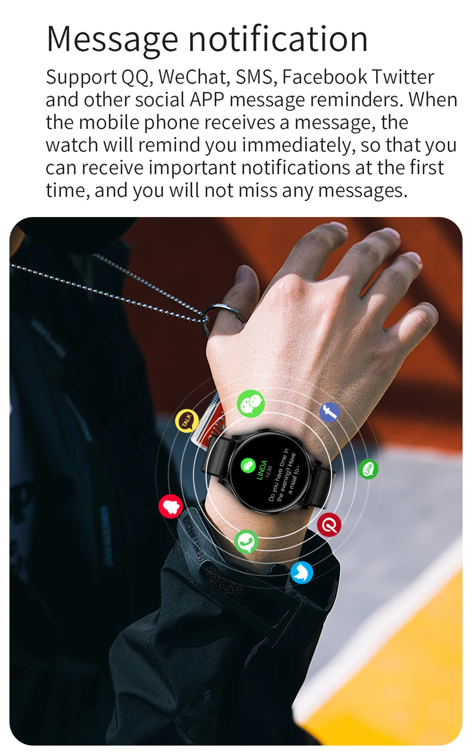 Custom wallpaper. Bluetooth call, music control, social APP message reminder, incoming call reminder, text message reminder, heart rate/blood pressure/blood oxygen monitoring, multiple exercise, alarm clock reminder, sedentary reminder, mobile phone search, music playback, stopwatch