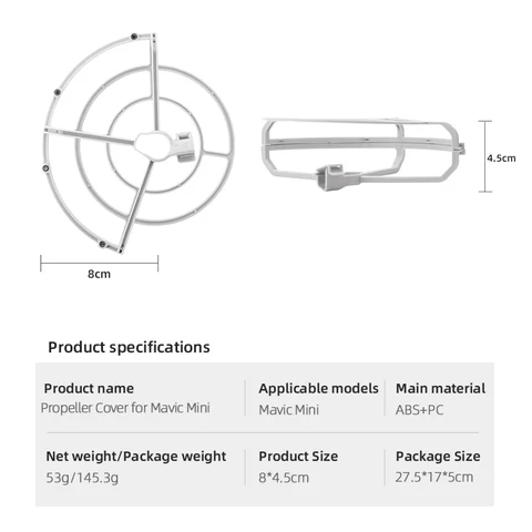 Product size: 8cm in radius, 4.5cm in height (Propeller Guard), 7.5*2.5*1cm(Propeller Fixer),