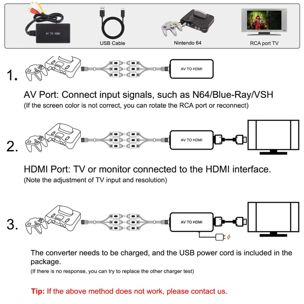 The AV to HDMI adapter is suitable for PS2, Xbox, Nintendo 64, Wii, STB, VHS, VCR, DVD players and other devices with standard composite AV output. Easily convert the RCA signal to HDMI output and play it on TV, VHS VCR, DVD recorder, etc.