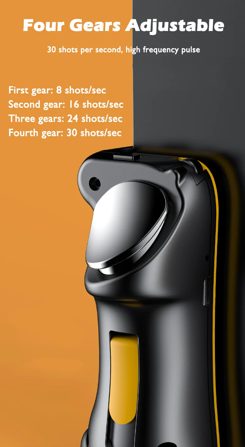 -High frequency capacitive pulse, four gears adjustable, no Bluetooth connection required, first gear 8 shots per second, second gear 16 shots per second, third gear 24 shots per second, fourth gear 30 shots per second
