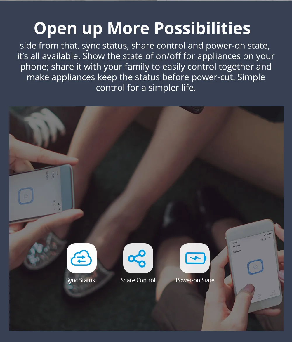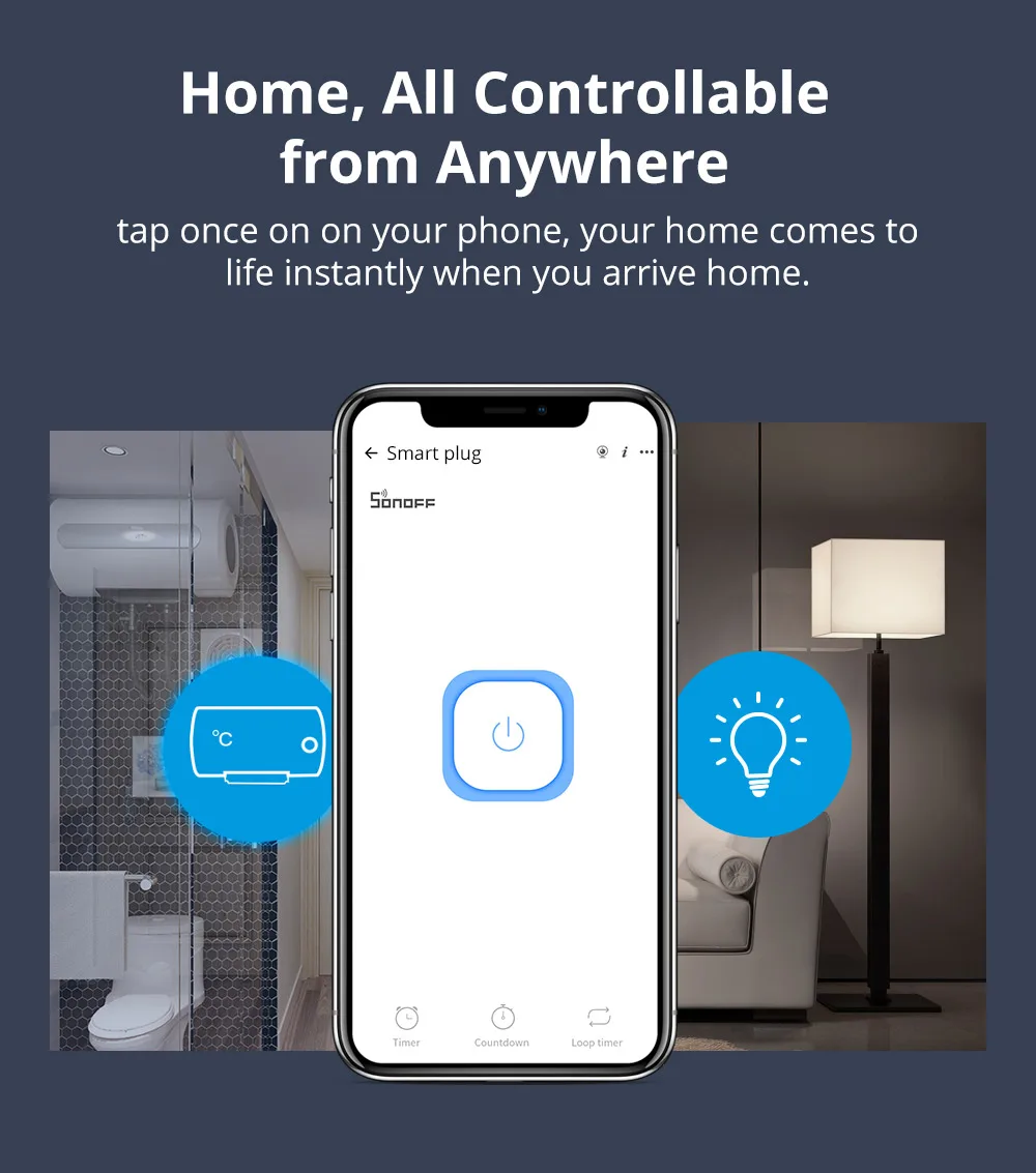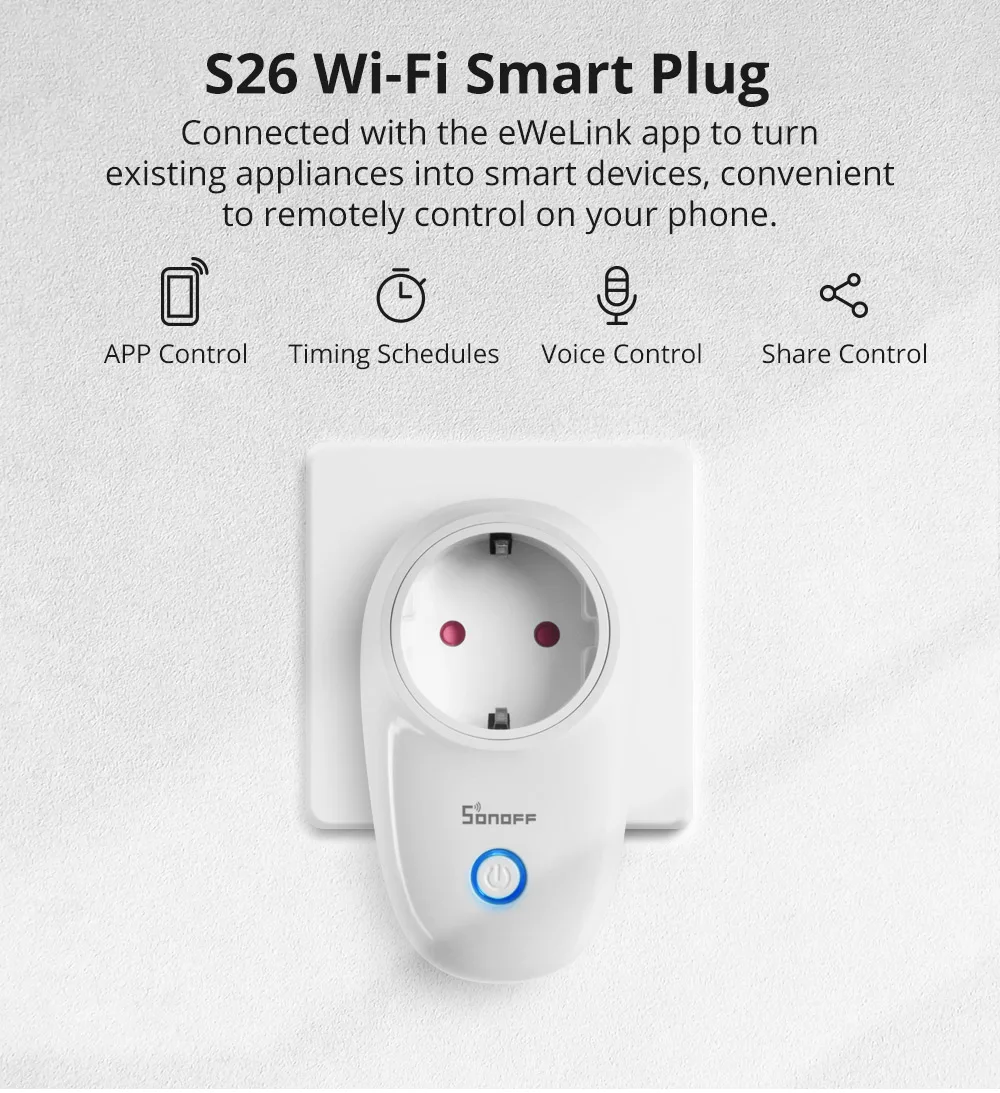 S26R2 is the upgrade version of S26 with EU(Type-F)/UK/BR standard that provides the simplest way to automate your devices and appliances, it is a smart Wi-Fi heavy-duty plug-in outlet that installs in any receptacle, users can instantly convert any plug into a smart outlet with a convenient timer function that works on user\\\\\\\'s smartphone. you can turn on/off any connected device either on the APP eWeLink or by pressing the manual control knob of the WiFi plug. you can set countdown/single/repeat timers to auto-turn on/off the WiFi controlled outlet on App. and can share the WiFi plug with your family so that you can control together, this makes it perfect to control lighting and other home appliances. what\\\\\\\'s more, S26R2 is also compatible with most voice-activated assistants that , such as Amazon Alexa and Google Assistant.
