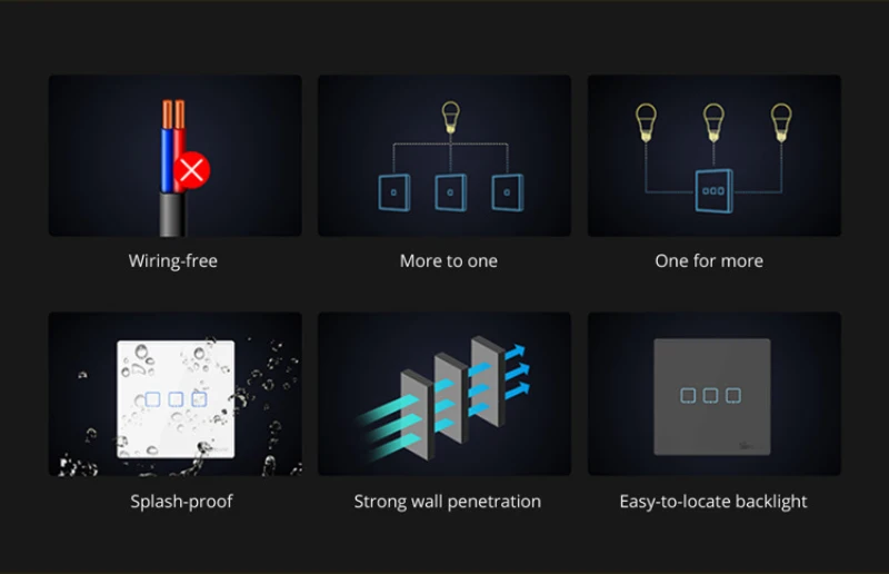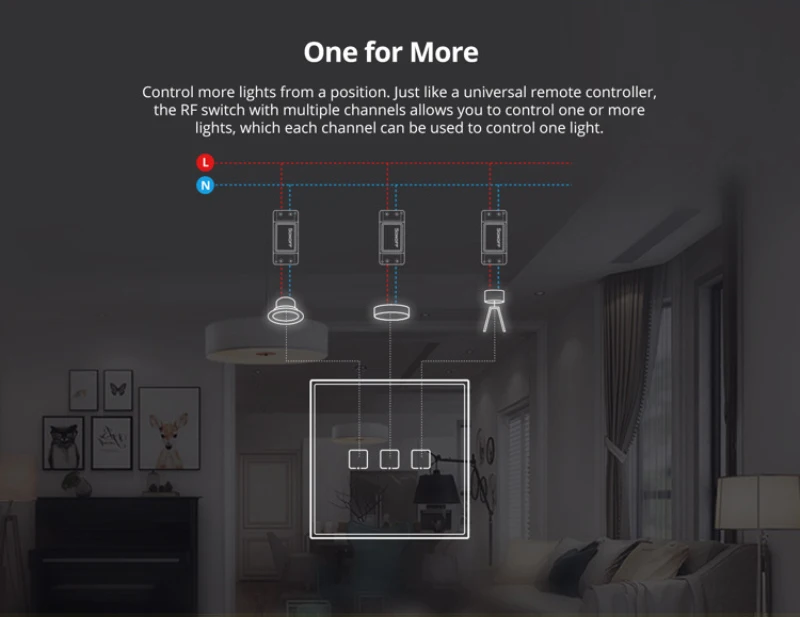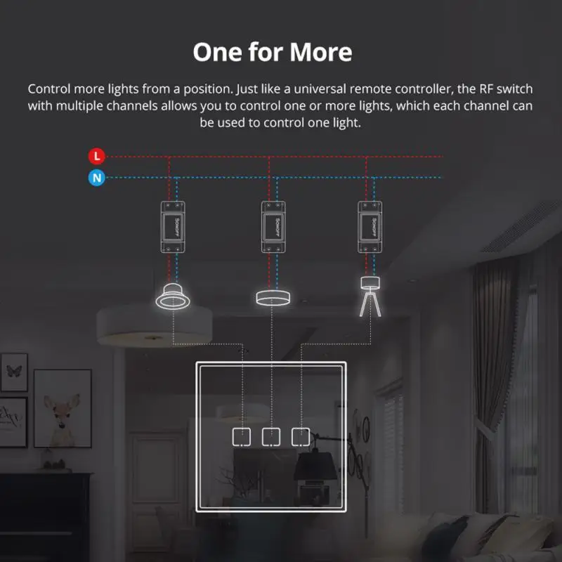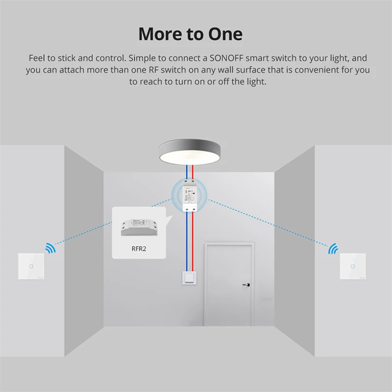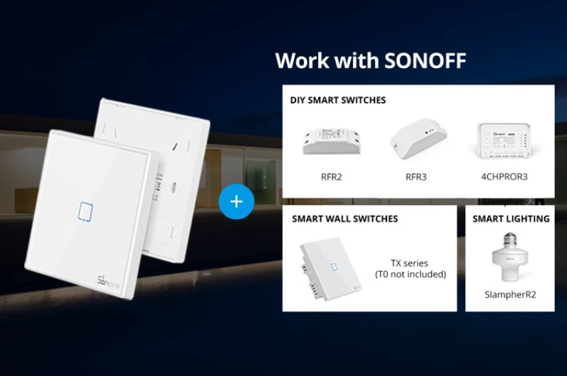 The remote controller with 1/2/3-gang works like other regular light switches but add the ability to control the connect lights from a distance, and no required to wire, simply stick on it to use. The multiple gangs allow you to realize two remote control solutions, one SONOFF remote controller for control multiple lights controlled and multiple SONOFF remote controllers for a light controlled. Plus, the remote controller can be used to connect with SONOFF T1/T2/T3 wall switch to achieve two-way control. It is also used for RFR2, RFR3, 4CHPROR3 and SlampherR2 which provides you one more control way except for APP remote control and voice control. The backlight is designed on the touch button to give you a clear location to control the light at night. The absorbing energy from light decides the brightness of backlight, the more energy it absorbs, the higher its brightness. Three using methods can be chosen from stick-on, screw-on and desk-top.