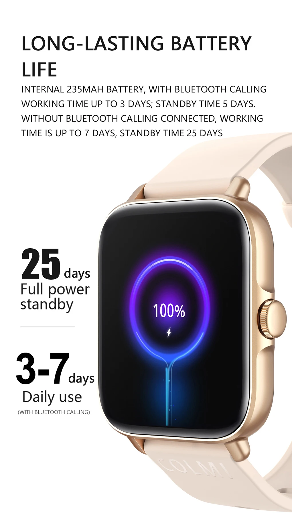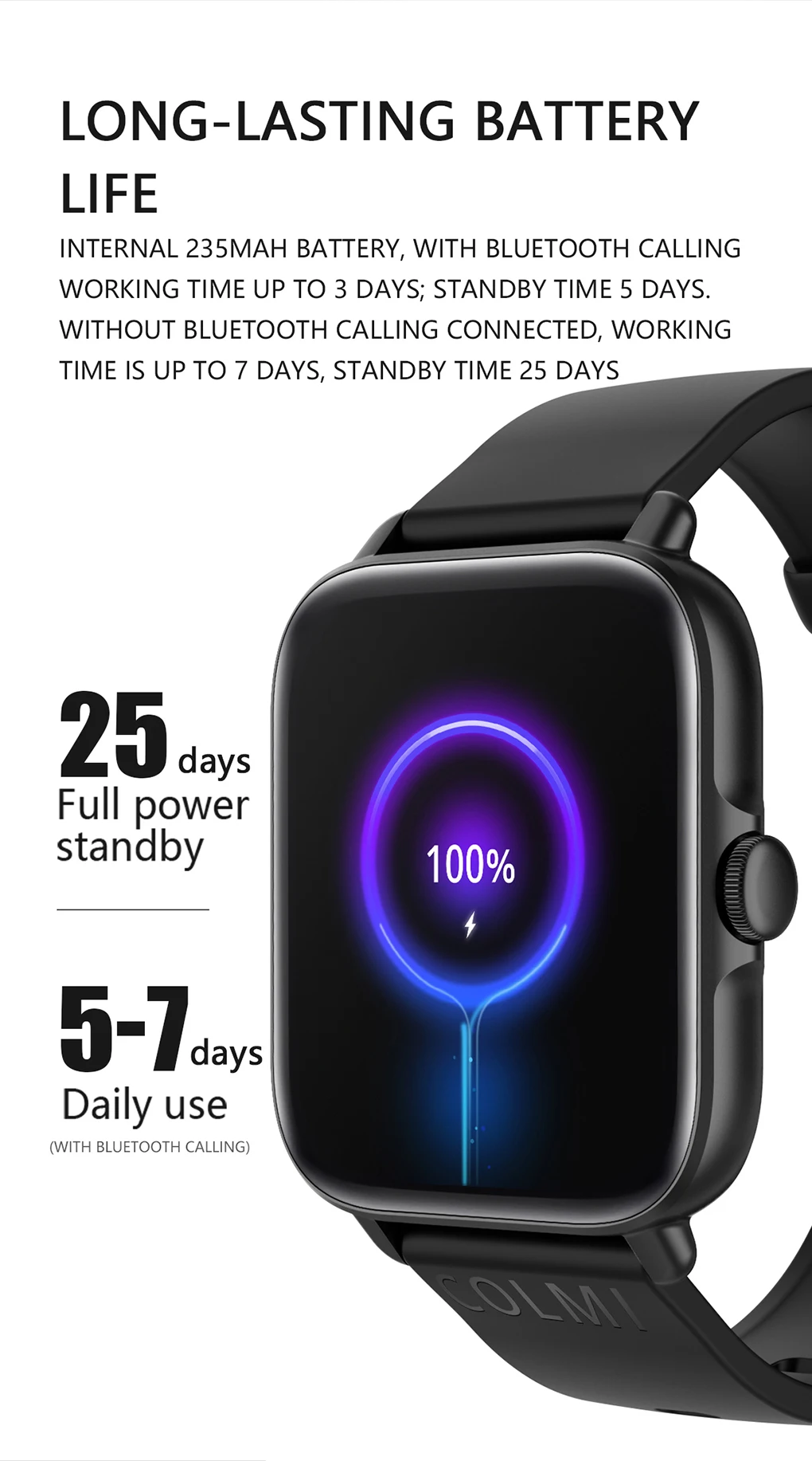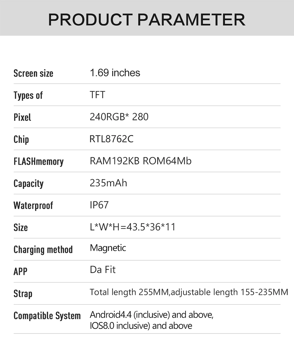 > Life: Bluetooth Answer Call, Bluetooth Dial Call, Messages Reminder, Alarm clock, Weather, Music remote, Camera remote, Flashlight, Find phone, Dynamic watch face, watch face market (100+ watch faces), custom watch faces(you can set the picture you like as the watch face), Set the screen off time, Do not disturb mode.