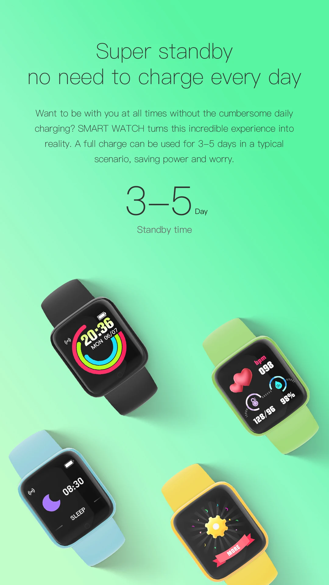 Dial push, step counting, mileage, calorie consumption, sleep detection, sedentary reminder, heart rate monitoring, blood pressure monitoring, blood oxygen monitoring, multi-sports mode (running, skipping rope, sit-ups), information push (QQ, WeChat, Facebook, WhatsAPP, Line, Twitter, Instagram), call reminder, text message reminder, smart alarm clock, shake to take pictures, find bracelet, find mobile phone, raise your hand to brighten the screen