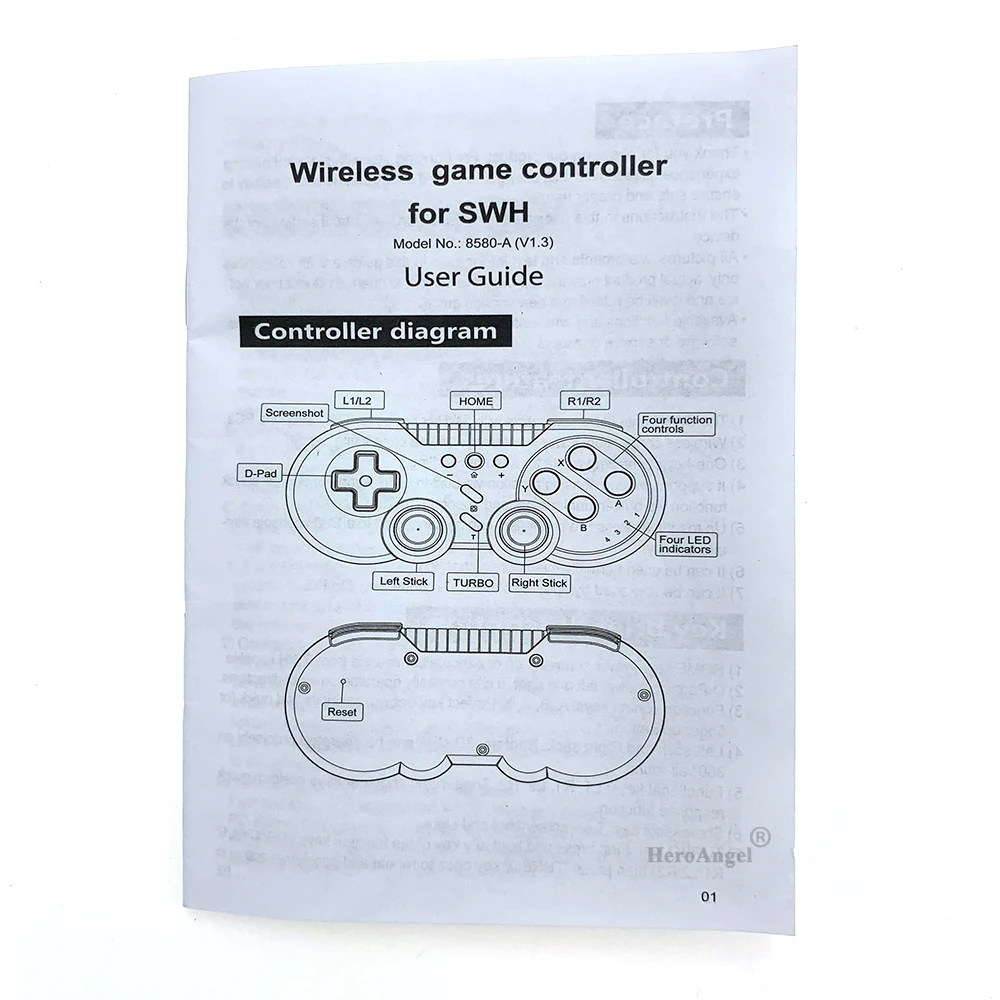 7) TURBO key: First press and hold any key of the function keys (A/B/X/Y/L1/R1/L2/R2) then press "TURBO" key once to repeat and accelerate action in a game. Press "TURBO" key once again to cancel the repeating and accelerating function. 8) Reset key: Short press this key in "RESET" hole to disconnect controller from console and reset the controller.