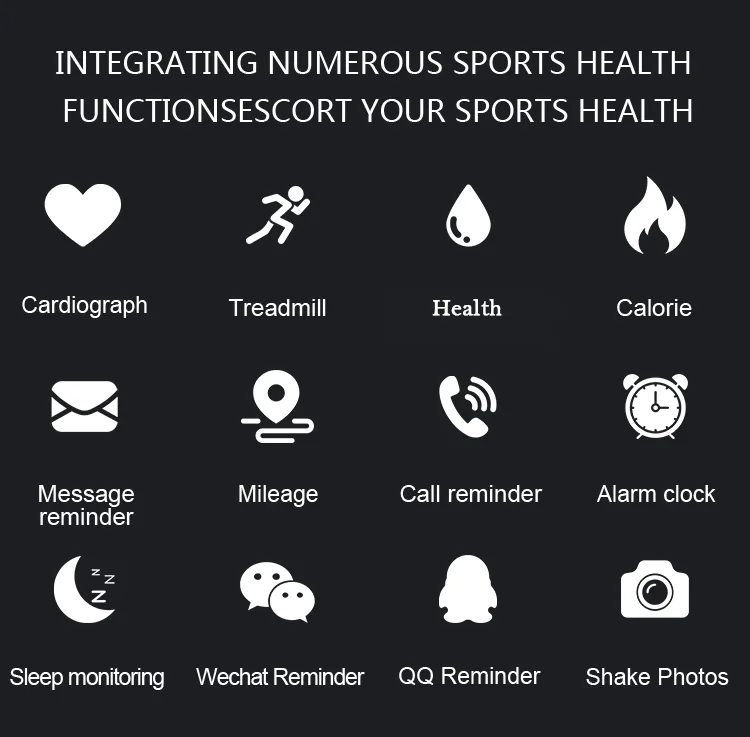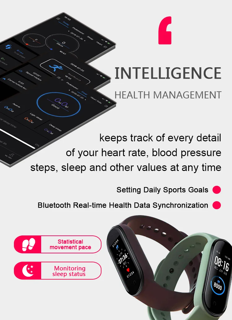 Functions: Time, Pedometer, Incoming Call Display, Heart Rate Measurement, Sleep Management, Message