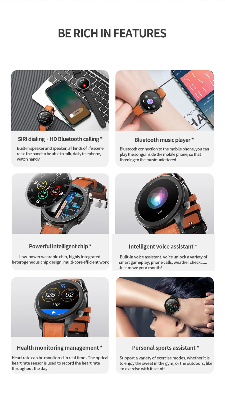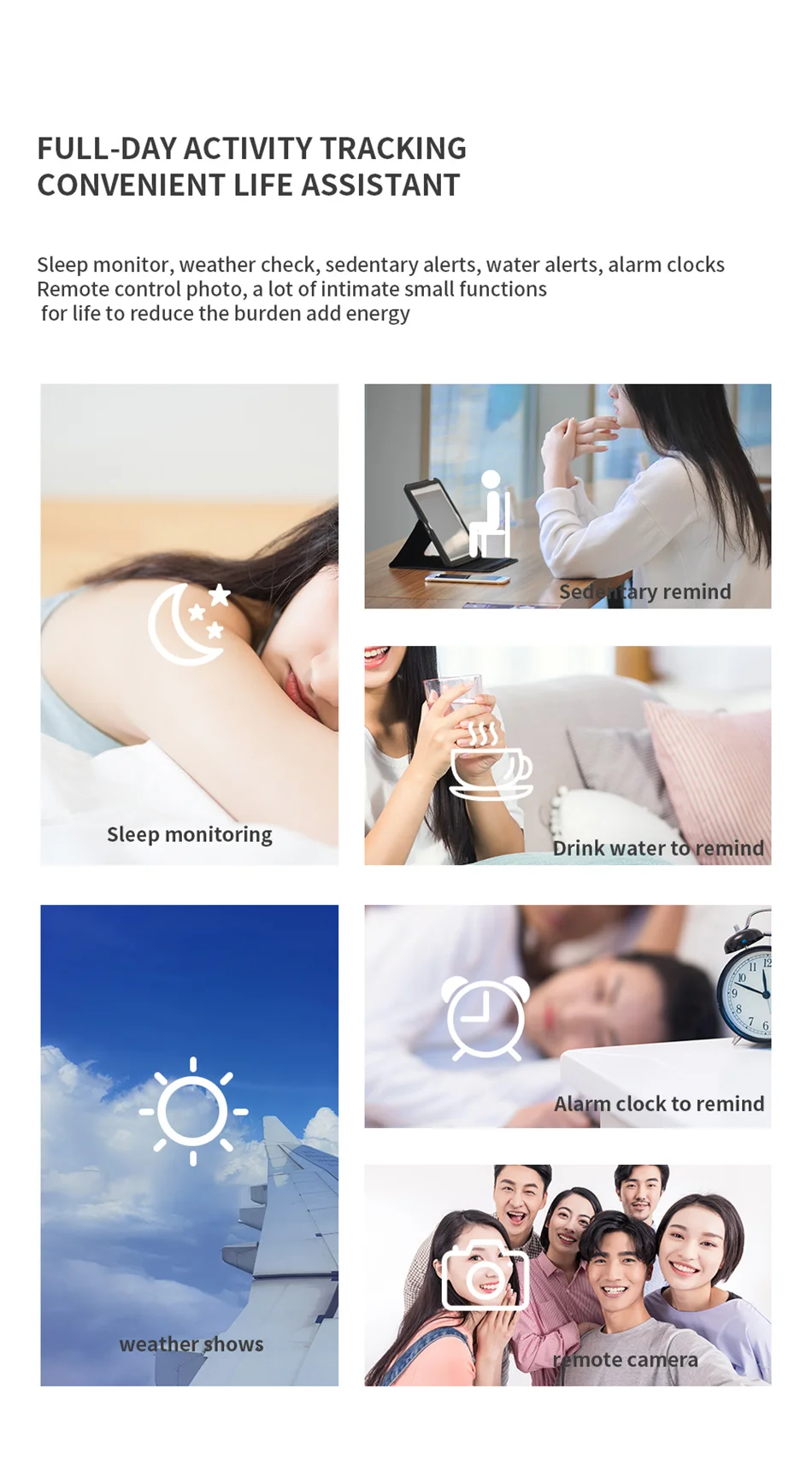 4. Sedentary reminder, online massive dial, anti-lost reminder, do not disturb mode, alarm clock, schedule reminder, remote camera, stopwatch, countdown, SIRI voice,