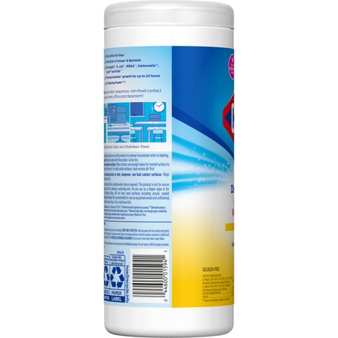 Clorox Disinfecting Wipes clean, disinfect, deodorize and remove allergens for 5x cleaning power* and leave a lemon scent. Disinfecting Wipes clean and disinfect with antibacterial power that kills 99.9% of viruses and bacteria that can live on surfaces, including COVID-19* Virus, staph, E. coli, MRSA, salmonella, strep and Kleb. These all-purpose disposable wipes remove common allergens, germs and messes on surfaces like kitchen counters, bathroom surfaces and more and can prevent the growth of bacteria* for up to 24 hours. Wipes are safe to use on finished wood, sealed granite and stainless steel. Clean with bleach-free wipes to keep dirt and germs away. *5x cleaning power: cleans, disinfects, deodorizes, removes allergens, leaves a scent, removes dirt, removes grime. Kills COVID-19 virus: kills SARS-CoV-2 on hard, nonporous surfaces. Use as directed. Prevents the growth of bacteria: odor causing bacteria on non-food contact surfaces. Allow product to air dry.