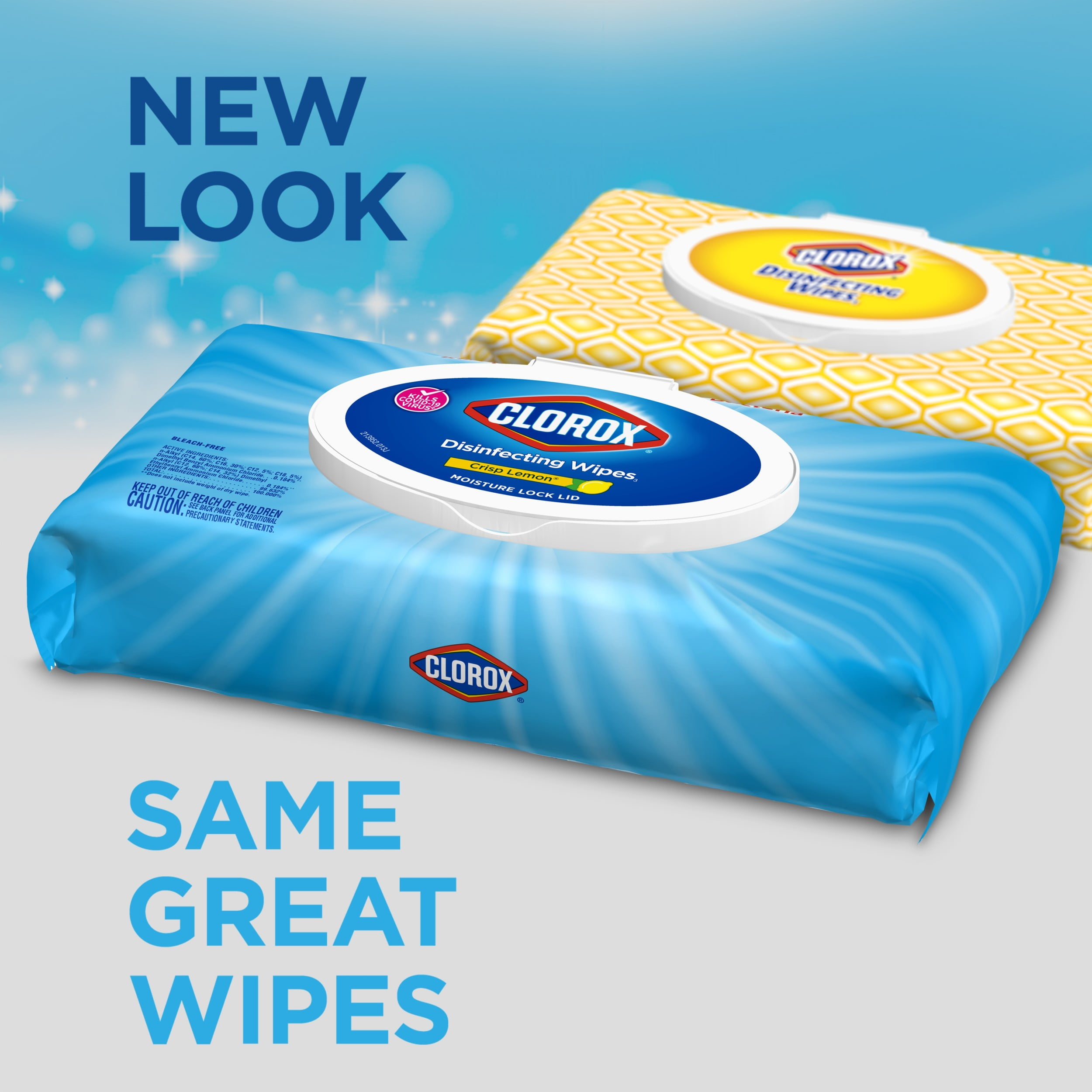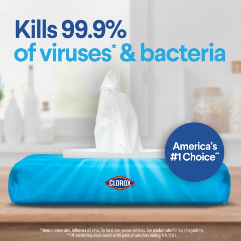 Clorox Disinfecting Wipes come in a convenient easy to pull dispensing pack make cleaning easy. This flexible pack allow you to easily dispense, clean and disinfect while storing, stacking or taking on the go is a breeze. Clorox Disinfecting Wipes clean, disinfect, deodorize and remove allergens for 5x cleaning power* and leave a lemon scent. Disinfecting Wipes kill 99.9% of viruses and bacteria that can live on surfaces, including COVID-19* Virus, staph, E. coli, MRSA, salmonella, strep and Kleb. These all-purpose wipes remove common allergens, germs and messes on kitchen counters, bathroom surfaces and more and can prevent the growth of bacteria* for up to 24 hours. *5x cleaning power: cleans, disinfects, deodorizes, removes allergens, leaves a scent, removes dirt, removes grime. Kills COVID-19 virus: kills SARS-CoV-2 on hard, nonporous surfaces. Use as directed. Prevents the growth of bacteria: odor causing bacteria on non-food contact surfaces. Allow product to air dry.