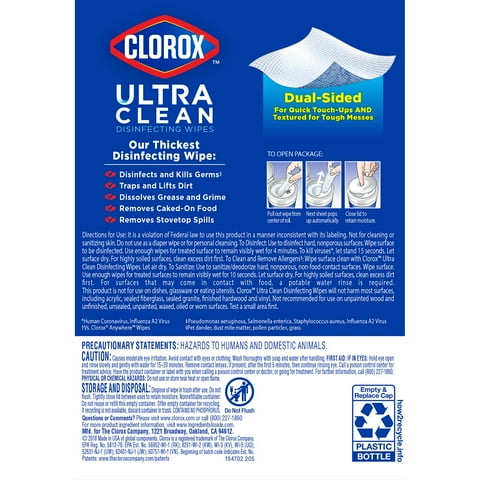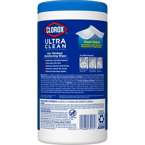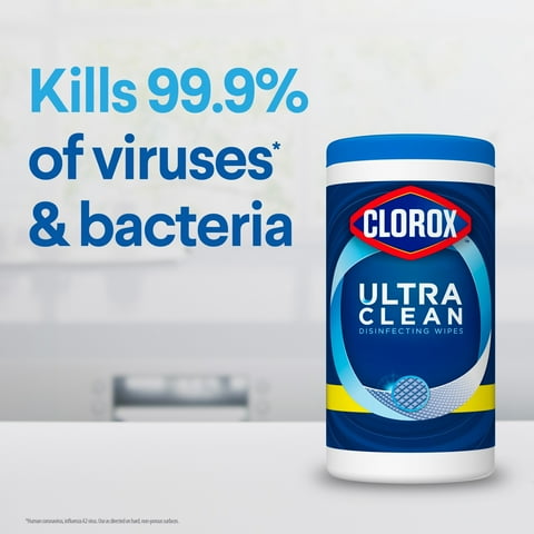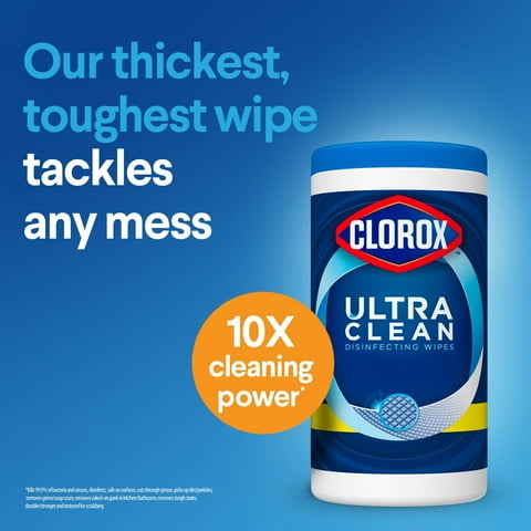 Clorox Ultra Clean Disinfecting Wipes in a Lemon Twist scent are Clorox thickest disinfecting wipe to outlast the toughest messes. Clorox Ultra Clean disinfecting wipes kill 99.9% of bacteria and viruses including cold and flu viruses, Staph, Salmonella, Strep, Kleb, MRSA and E. coli. The dual-sided, grime catching ridges trap particles which makes these cleaning wipes suitable and safe to use on an array of kitchen and bathroom surfaces like counters, sinks, tubs, showers, finished hardwood and sealed granite. These textured wipes are great for scouring baked on food, stovetop spills and soap scum with ease. With a clear drying formula, these cleaning wipes also work great on a variety of shiny surfaces like stainless steel, mirrors and glass. Disinfect and wipe up stubborn messes with Clorox Disinfecting Wipes.
