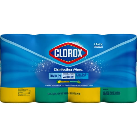 Clorox Disinfecting Wipes clean, disinfect, deodorize and remove allergens for 5x cleaning power* and leave a pleasant scent. Disinfecting Wipes clean and disinfect with antibacterial power that kills 99.9% of viruses and bacteria that can live on surfaces, including COVID-19* Virus, staph, E. coli, MRSA, salmonella, strep and Kleb. These all-purpose disposable wipes remove common allergens, germs and messes on surfaces like kitchen counters, bathroom surfaces and more and can prevent the growth of bacteria* for up to 24 hours. Wipes are safe to use on finished wood, sealed granite and stainless steel. Clean with bleach-free wipes to keep dirt and germs away. *5x cleaning power: cleans, disinfects, deodorizes, removes allergens, leaves a scent, removes dirt, removes grime. Kills COVID-19 virus: kills SARS-CoV-2 on hard, nonporous surfaces. Use as directed. Prevents the growth of bacteria: odor causing bacteria on non-food contact surfaces. Allow product to air dry.